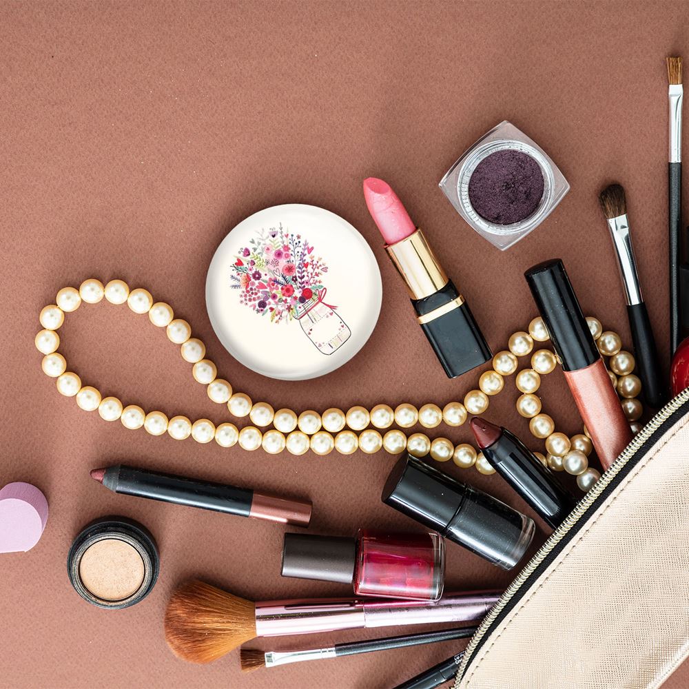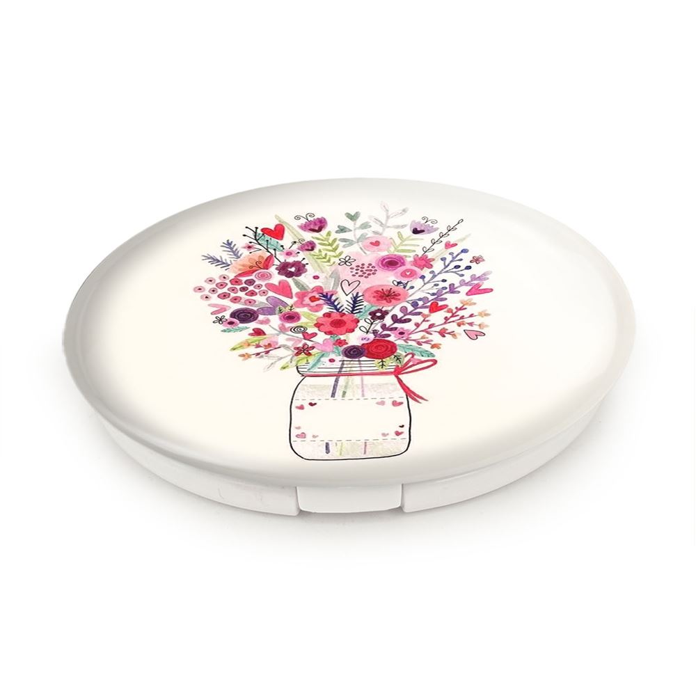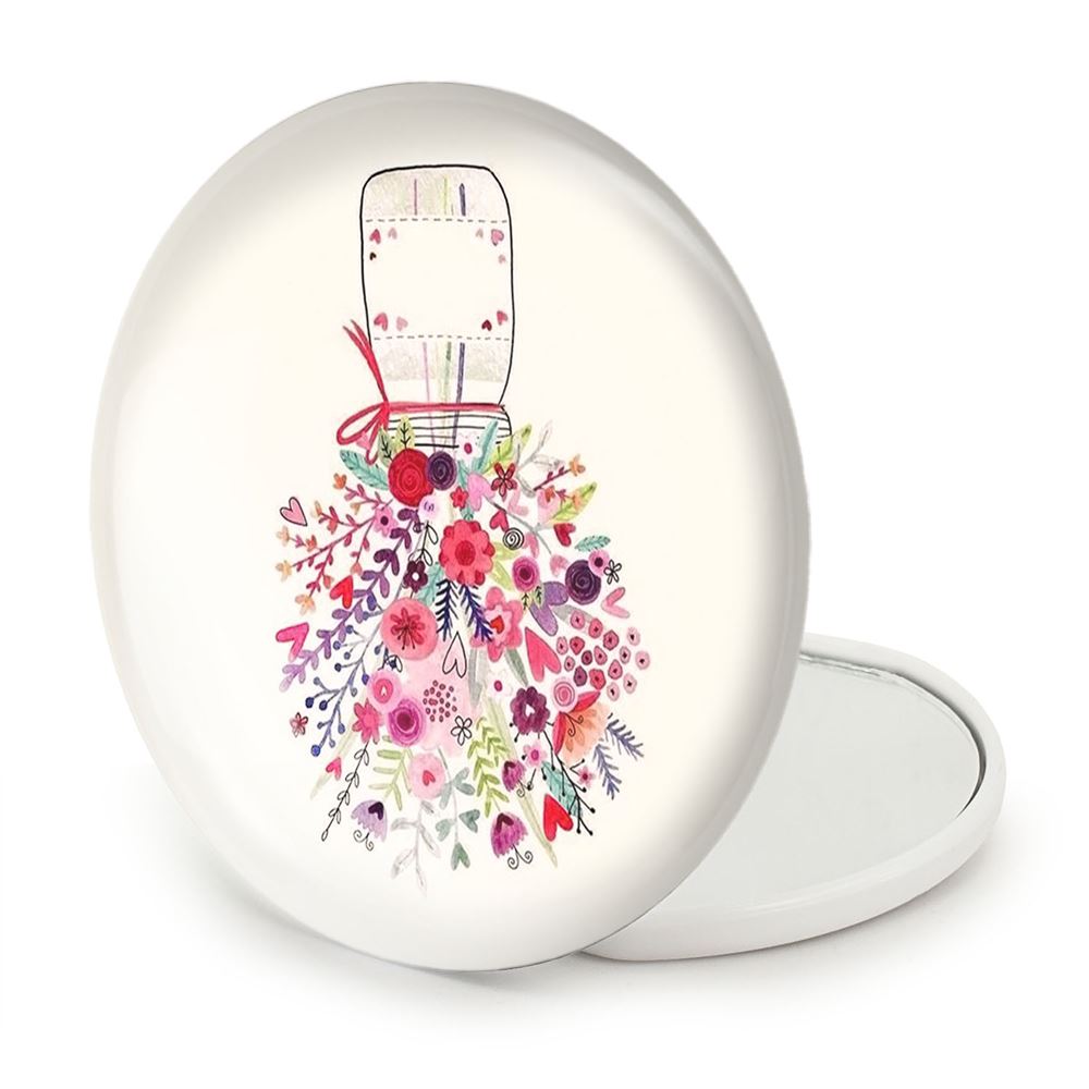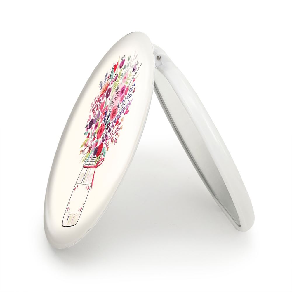 آینه های تاشو گل و گلدون خندالو، از جنس پلاستیک فشرده ABS تولید شده و به رنگ سفید می باشد. یکی از آینه ها ابعاد واقعی را نشان داده و دیگری با قابلیت بزرگنمایی، جزئیات را بهتر نمایش می دهد. ابعاد هر یک از آینه ها، دایره ای به قطر 7.5 سانت می باشد که نه خیلی بزرگ و غیر قابل استفاده در کیف آرایشی ست و نه خیلی کوچک که تصویر خاصی در آن مشاهده نشود. آینه تاشو گل و گلدون سایزی استاندارد و کارآمد دارد و در هر کیفی جا میگیرد. چاپ طرح بوسیله چاپگرهای دیجیتال شش رنگ با شفافیت و کیفیتی مثال زدنی بر روی یک وجه از بدنه ی آینه انجام گرفته و با روکش لمینت حرارتی پوشیده شده که در مقابل آسیب و خط و خش مقاوم بوده و کیفیت بالایی دارد. درب آینه بوسیله قفل بدنه ی آن، باز نمی ماند و کاملا بسته می شود و مناسب قرار گیری در کیف لوازم آرایش و کیف های کوچک دستی نیز هست. آینه های تاشو گل و گلدون خندالو با تنوع طرحی بسیار بالا، سلیقه هر نوع مخاطبی را تامین میکند.