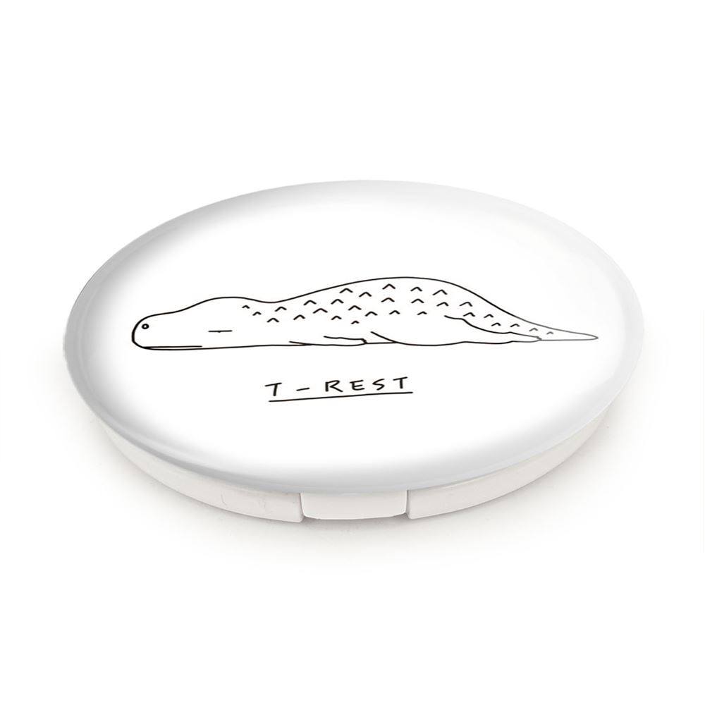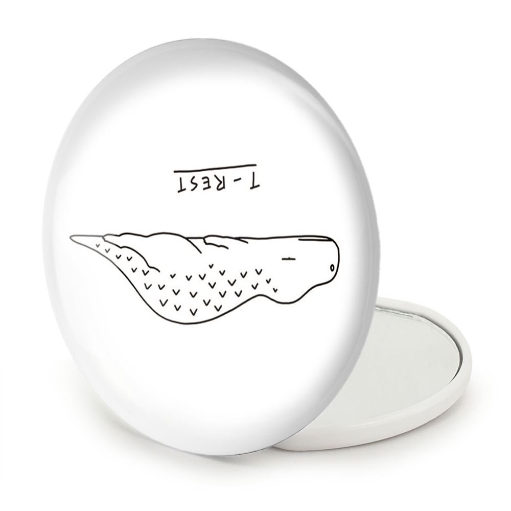 آینه های تاشو دایناسور تی رکس خندالو، از جنس پلاستیک فشرده ABS تولید شده و به رنگ سفید می باشد. یکی از آینه ها ابعاد واقعی را نشان داده و دیگری با قابلیت بزرگنمایی، جزئیات را بهتر نمایش می دهد. ابعاد هر یک از آینه ها، دایره ای به قطر 7.5 سانت می باشد که نه خیلی بزرگ و غیر قابل استفاده در کیف آرایشی ست و نه خیلی کوچک که تصویر خاصی در آن مشاهده نشود. آینه تاشو دایناسور تی رکس سایزی استاندارد و کارآمد دارد و در هر کیفی جا میگیرد. چاپ طرح بوسیله چاپگرهای دیجیتال شش رنگ با شفافیت و کیفیتی مثال زدنی بر روی یک وجه از بدنه ی آینه انجام گرفته و با روکش لمینت حرارتی پوشیده شده که در مقابل آسیب و خط و خش مقاوم بوده و کیفیت بالایی دارد. درب آینه بوسیله قفل بدنه ی آن، باز نمی ماند و کاملا بسته می شود و مناسب قرار گیری در کیف لوازم آرایش و کیف های کوچک دستی نیز هست. آینه های تاشو دایناسور تی رکس خندالو با تنوع طرحی بسیار بالا، سلیقه هر نوع مخاطبی را تامین میکند.