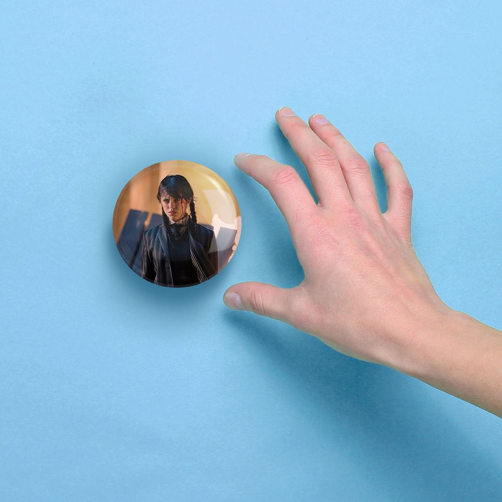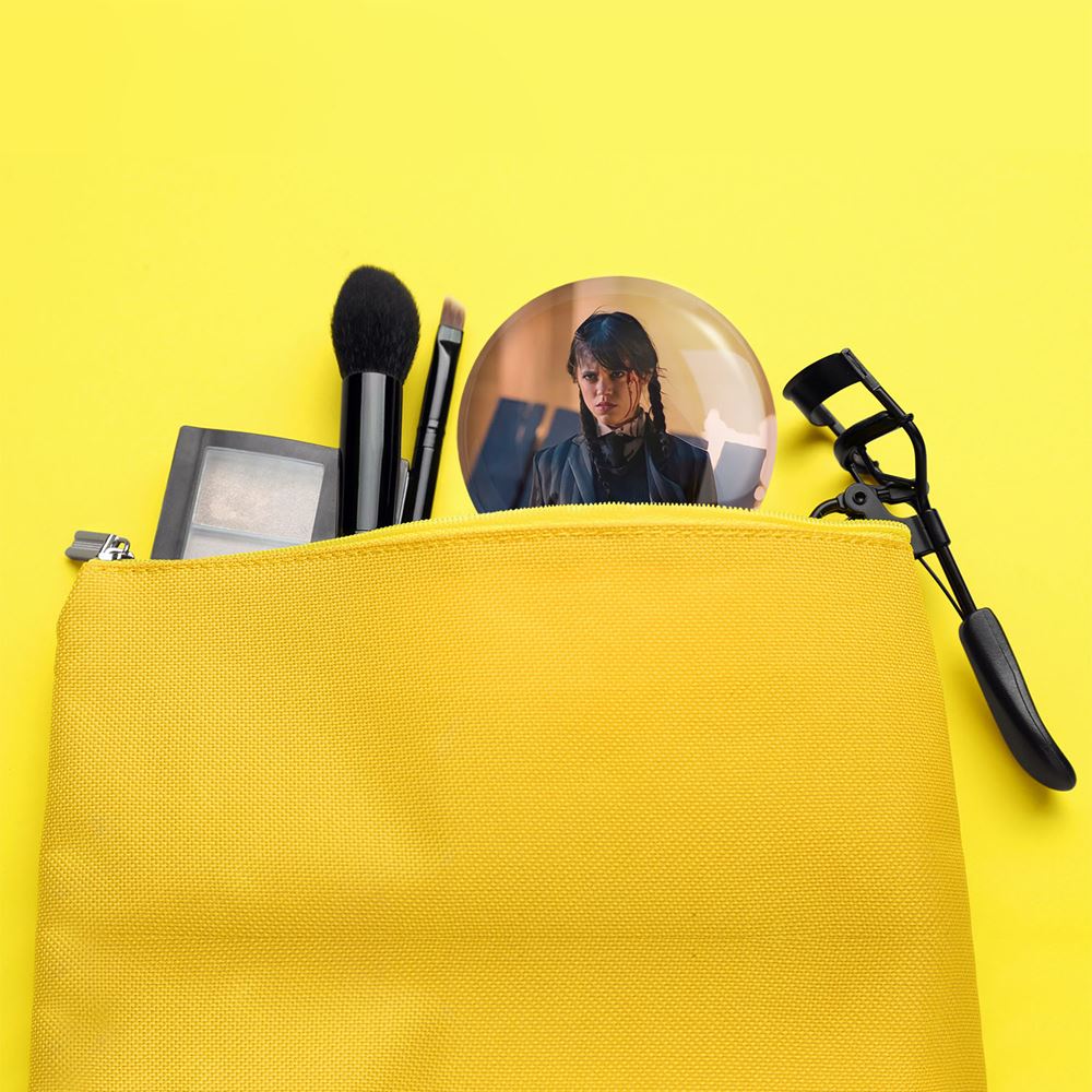 آینه های جیبی سریال ونزدی Wednesday خندالو دایره ای به قطر 7.5 سانتی متر می باشد که نه خیلی بزرگ و غیر قابل استفاده در کیف آرایشی ست و نه خیلی کوچک که تصویر خاصی در آن مشاهده نشود. سایزی استاندارد و کارآمد دارد و مناسب قرار گیری در کیف لوازم آرایش و کیف های کوچک دستی نیز هست.