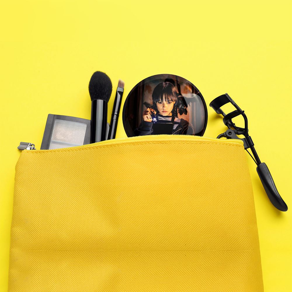 آینه های جیبی سریال ونزدی Wednesday خندالو دایره ای به قطر 7.5 سانتی متر می باشد که نه خیلی بزرگ و غیر قابل استفاده در کیف آرایشی ست و نه خیلی کوچک که تصویر خاصی در آن مشاهده نشود. سایزی استاندارد و کارآمد دارد و مناسب قرار گیری در کیف لوازم آرایش و کیف های کوچک دستی نیز هست.