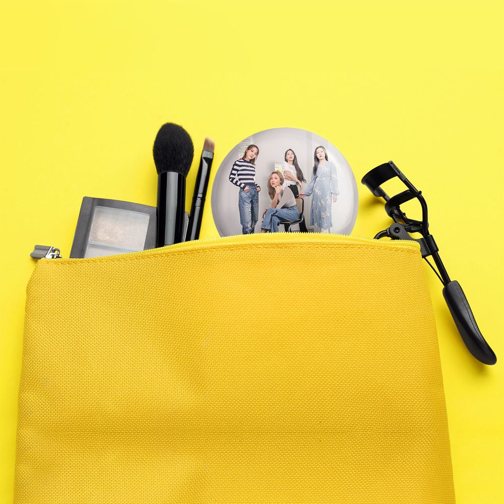 آینه های جیبی گروه مامامو Mamamoo خندالو دایره ای به قطر 7.5 سانتی متر می باشد که نه خیلی بزرگ و غیر قابل استفاده در کیف آرایشی ست و نه خیلی کوچک که تصویر خاصی در آن مشاهده نشود. سایزی استاندارد و کارآمد دارد و مناسب قرار گیری در کیف لوازم آرایش و کیف های کوچک دستی نیز هست.