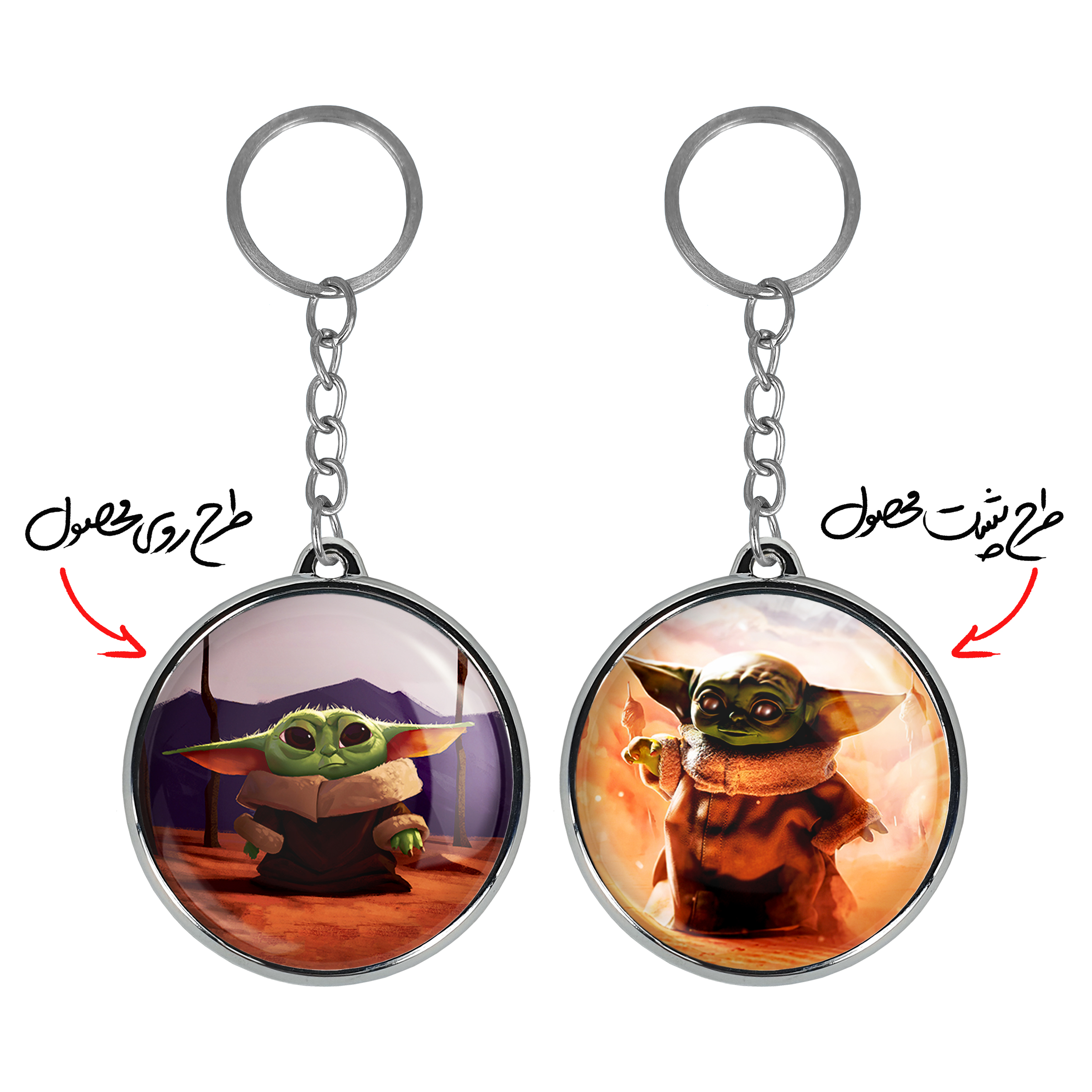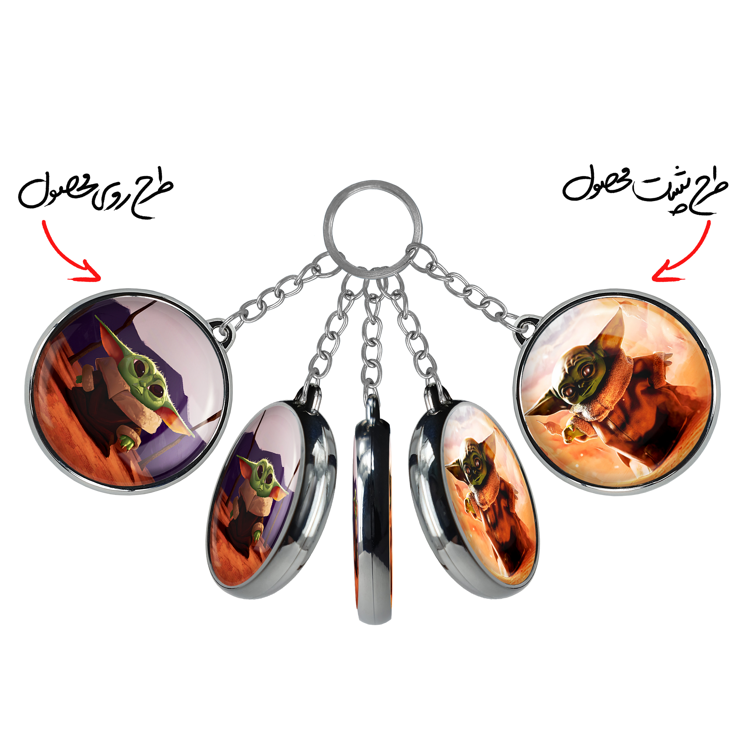 جاکلیدی دوطرفه یودا سریال جنگ ستارگانخندالو محصولی کاربردی و جدید است که در هر دو سمت محصول، تصویری متفاوت اما از یک موضوع چاپ شده و تفاوت اصلی آن با جاکلیدی های یک طرفه در همین است که هر دو سمت پشت و روی جاکلیدی، طرحی دیدنی و جذاب دارد. همچنین رینگ بکار برده شده برای دور طرح ها آبکاری کروم درجه یک و رنگ ثابت است و برخلاف سایر محصولات مشابه، از رنگ های متفرقه و یا سفید استفاده نشده، که این مهم، زیبایی محصول نهایی را چند برابر کرده است. جاکلیدی های دوطرفه یودا سریال جنگ ستارگانبا استفاده از روکش سلفون براق ضدخش تولید شده که خاصیت ضدخش بودن آن عمر مفید استفاده از جاکلیدی ها را افزایش میدهد. چاپ جاکلیدی ها با دستگاه های استاندارد و با بهترین سطح کیفیت صورت گرفته و طرح با شفافیتی مثال زدنی و با سلفون چسبی تولید شده است که باعث شده محصول نهایی بدون شکست نور دیده شود. همچنین بسته بندی جذاب و مینیمال جاکلیدی دوطرفه یودا سریال جنگ ستارگان، آنها را محصولی مناسب هدیه کرده است. زنجیر و حلقه بکار برده شده در جاکلیدی خندالو از نوع حلقه ضخیم و محکم بوده و حین استفاده آسیب نمی بیند.