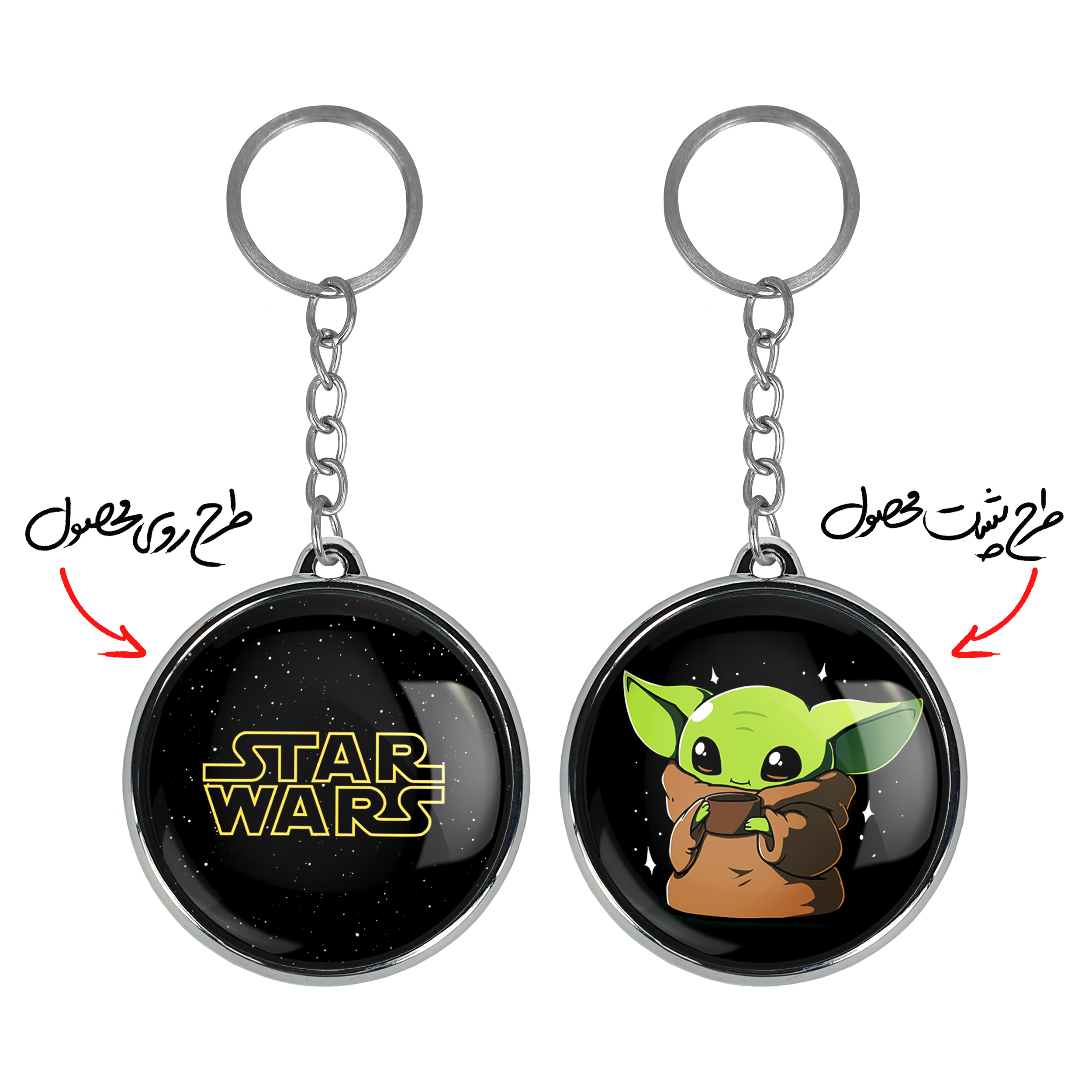 جاکلیدی دوطرفه جنگ ستارگان Star Wars خندالو محصولی کاربردی و جدید است که در هر دو سمت محصول، تصویری متفاوت اما از یک موضوع چاپ شده و تفاوت اصلی آن با جاکلیدی های یک طرفه در همین است که هر دو سمت پشت و روی جاکلیدی، طرحی دیدنی و جذاب دارد. همچنین رینگ بکار برده شده برای دور طرح ها آبکاری کروم درجه یک و رنگ ثابت است و برخلاف سایر محصولات مشابه، از رنگ های متفرقه و یا سفید استفاده نشده، که این مهم، زیبایی محصول نهایی را چند برابر کرده است. جاکلیدی های دوطرفه جنگ ستارگان Star Wars با استفاده از روکش سلفون براق ضدخش تولید شده که خاصیت ضدخش بودن آن عمر مفید استفاده از جاکلیدی ها را افزایش میدهد. چاپ جاکلیدی ها با دستگاه های استاندارد و با بهترین سطح کیفیت صورت گرفته و طرح با شفافیتی مثال زدنی و با سلفون چسبی تولید شده است که باعث شده محصول نهایی بدون شکست نور دیده شود. همچنین بسته بندی جذاب و مینیمال جاکلیدی دوطرفه جنگ ستارگان Star Wars ، آنها را محصولی مناسب هدیه کرده است. زنجیر و حلقه بکار برده شده در جاکلیدی خندالو از نوع حلقه ضخیم و محکم بوده و حین استفاده آسیب نمی بیند.