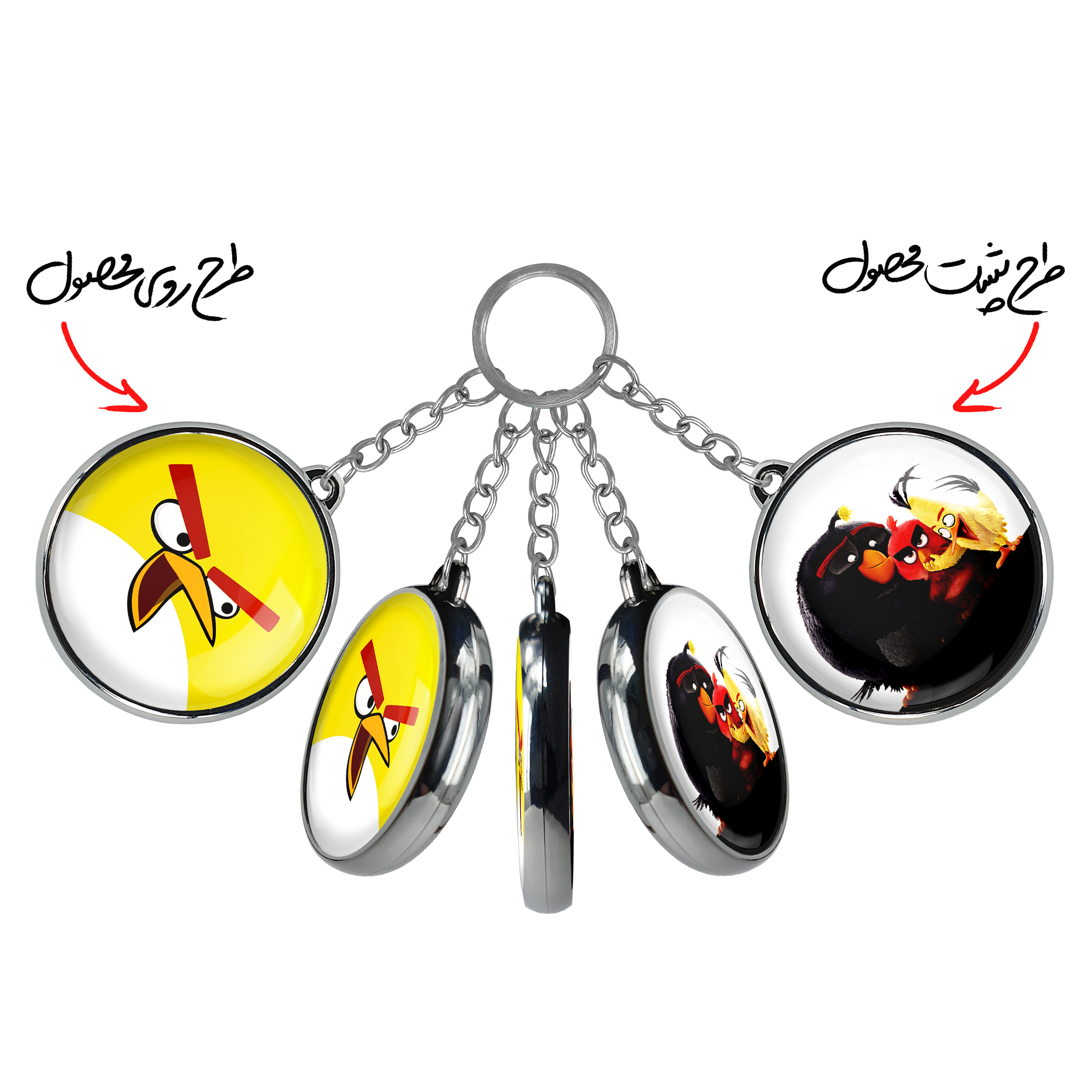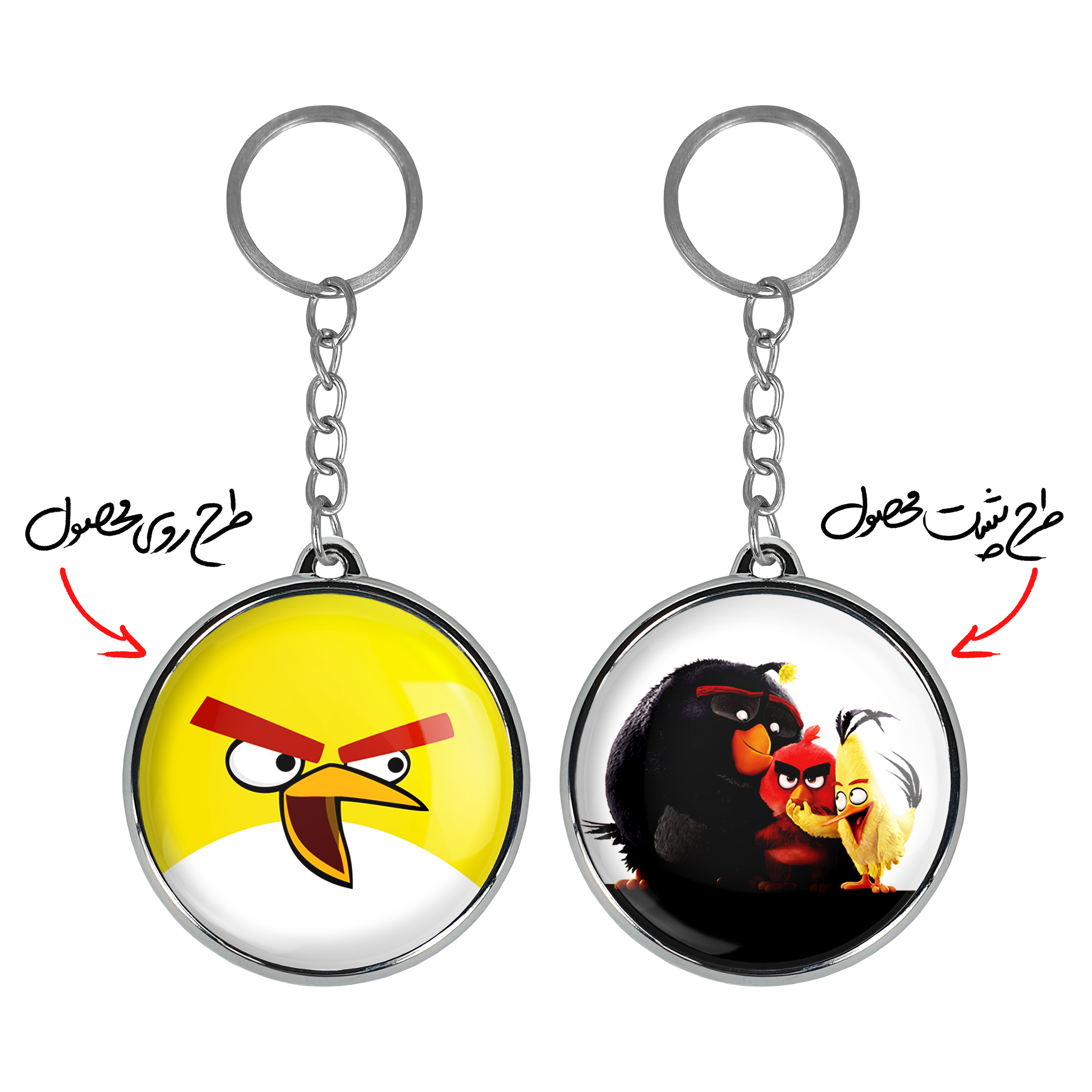 جاکلیدی دوطرفه چاک پرندگان خشمگین Angry Birds خندالو محصولی کاربردی و جدید است که در هر دو سمت محصول، تصویری متفاوت اما از یک موضوع چاپ شده و تفاوت اصلی آن با جاکلیدی های یک طرفه در همین است که هر دو سمت پشت و روی جاکلیدی، طرحی دیدنی و جذاب دارد. همچنین رینگ بکار برده شده برای دور طرح ها آبکاری کروم درجه یک و رنگ ثابت است و برخلاف سایر محصولات مشابه، از رنگ های متفرقه و یا سفید استفاده نشده، که این مهم، زیبایی محصول نهایی را چند برابر کرده است. جاکلیدی های دوطرفه چاک پرندگان خشمگین Angry Birds با استفاده از روکش سلفون براق ضدخش تولید شده که خاصیت ضدخش بودن آن عمر مفید استفاده از جاکلیدی ها را افزایش میدهد. چاپ جاکلیدی ها با دستگاه های استاندارد و با بهترین سطح کیفیت صورت گرفته و طرح با شفافیتی مثال زدنی و با سلفون چسبی تولید شده است که باعث شده محصول نهایی بدون شکست نور دیده شود. همچنین بسته بندی جذاب و مینیمال جاکلیدی دوطرفه چاک پرندگان خشمگین Angry Birds ، آنها را محصولی مناسب هدیه کرده است. زنجیر و حلقه بکار برده شده در جاکلیدی خندالو از نوع حلقه ضخیم و محکم بوده و حین استفاده آسیب نمی بیند.