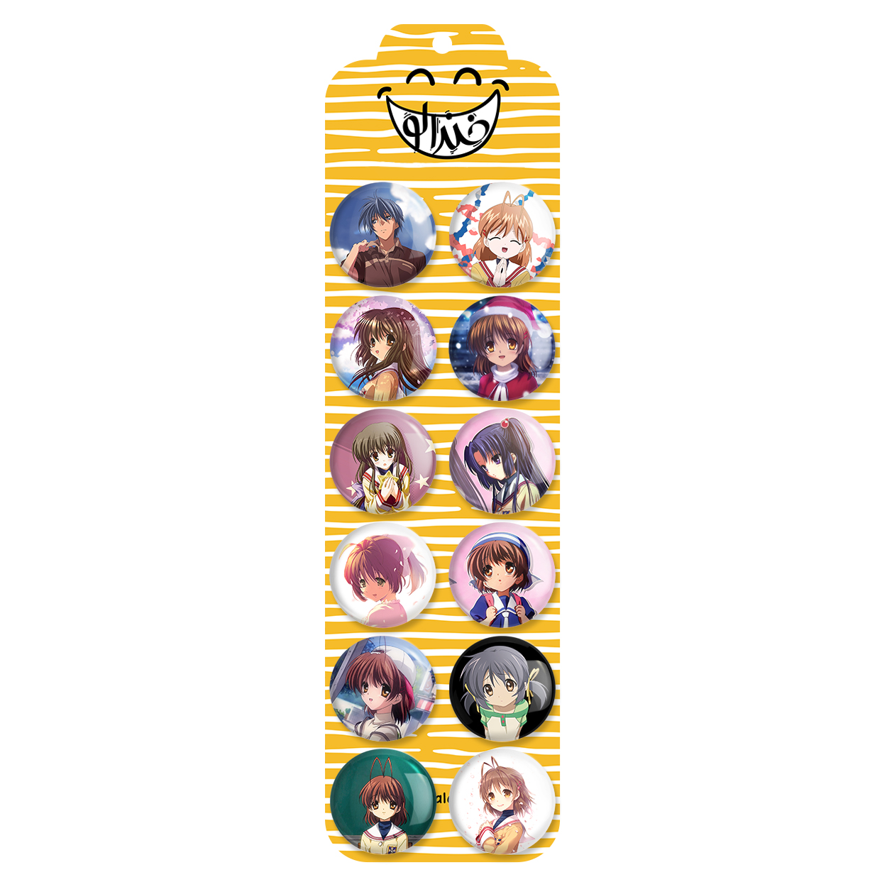 پک 12 عددی پیکسل خندالو طرح انیمه کلاناد (Clannad) با روکش سلفون حرارتی براق ضدخش و قطعه پشتی رنگی تولید شده است. قطعات پشتی از میان 6 رنگ سفید، مشکی، صورتی، زرد، آبی و قرمز که با توجه به نوع و رنگبندی طرح روی پیکسل انتخاب شده اند تولید می شود و در هر بسته بندی مطابق عکس محصول می باشد. قطعات پلاستیکی پشت پیکسل با سوزن یک تکه ثابت و بدون لغزش و جا به جایی، ایستایی بسیار بهتری نسبت به پشتی فلزی پیکسل دارند که این مهم در تولید این محصول نیز رعایت شده است.