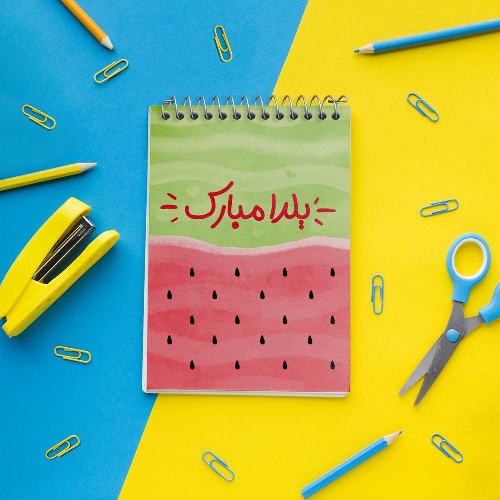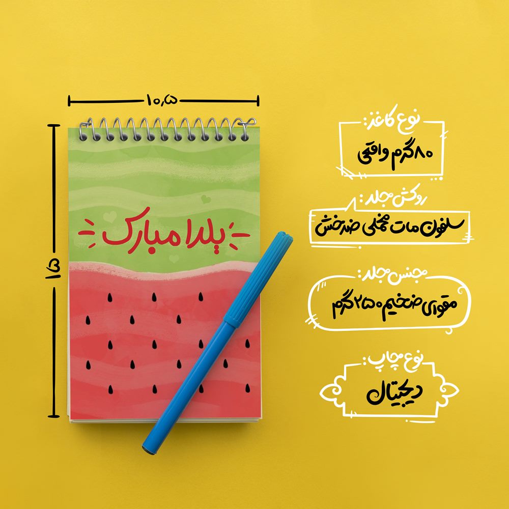 برند خندالو در زمینه تولید انواع دفاتر فانتزی و تحصیلی فعالیت میکند که به دلیل جذابیت ظاهری و طرح های متنوع طرفداران زیادی دارد. دفتر یادداشت خندالو طرح شب یلدا محصولی مناسب برای همه عاشقان لوازم التحریر است و همچنین همه کسانی که بنا به موقعیت تحصیل یا شغلشان با دفتر و نوشت افزار زیاد سر و کار دارند. در تولید دفتر یادداشت خندالو طرح شب یلدا از نوع صحافی فنر مارپیچ استفاده شده که در این نوع صحافی برگه‌ها به راحتی چرخیده و یا بیرون آورده می شوند.