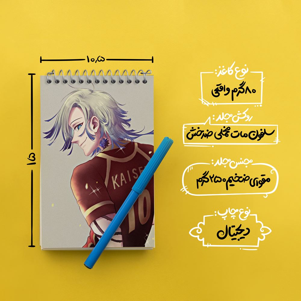 برند خندالو در زمینه تولید انواع دفاتر فانتزی و تحصیلی فعالیت میکند که به دلیل جذابیت ظاهری و طرح های متنوع طرفداران زیادی دارد. دفتر یادداشت خندالو طرح سیشیرو انیمه بلو لاک Blue Lock محصولی مناسب برای همه عاشقان لوازم التحریر است و همچنین همه کسانی که بنا به موقعیت تحصیل یا شغلشان با دفتر و نوشت افزار زیاد سر و کار دارند. در تولید دفتر یادداشت خندالو طرح سیشیرو انیمه بلو لاک Blue Lock از نوع صحافی فنر مارپیچ استفاده شده که در این نوع صحافی برگهها به راحتی چرخیده و یا بیرون آورده می شوند. دفتر های خندالو دارای جلد انعطاف پذیر از جنس مقوای گلاسه 250 گرم با روکش سلفون مات مخملی است که به شما امکان میدهد از دفتر خود بدون اینکه نگرانی از شکستن یا خراب شدن جلد را داشته باشید استفاده کنید و همچنین در این دفاتر از کاغذ 80 گرم با کیفیت استفاده شده که باعث میشود هنگام نوشتن به خوبی جوهر قلم بر روی صفحه نشسته و از خط خوردگیها جلوگیری کند. دفتر یادداشت خندالو با جنس و دوام مناسب، برگه های کاملاً سفید و خطوط طوسی دقیق را داراست که انسان را به نوشتن منظم و زیبا ترغیب میکند. طراحی کاملاً مناسب این دفاتر، به همراه کیفیت بالا، از آن یک محصول مورد علاقه و قابل اعتماد برای همه مقاطع تحصیلی میسازد. دفتر یادداشت خندالو طرح سیشیرو انیمه بلو لاک Blue Lock انتخابی هوشمندانه و مناسب برای افرادی است که به دنبال دفتری با کیفیت و کاربرد عالی هستند. این دفتر، همراه خوبی برای شما در تمام مراحل تحصیل و کار خواهد بود و تجربهای لذتبخش از نوشتن و آموختن را به شما هدیه میدهد.
