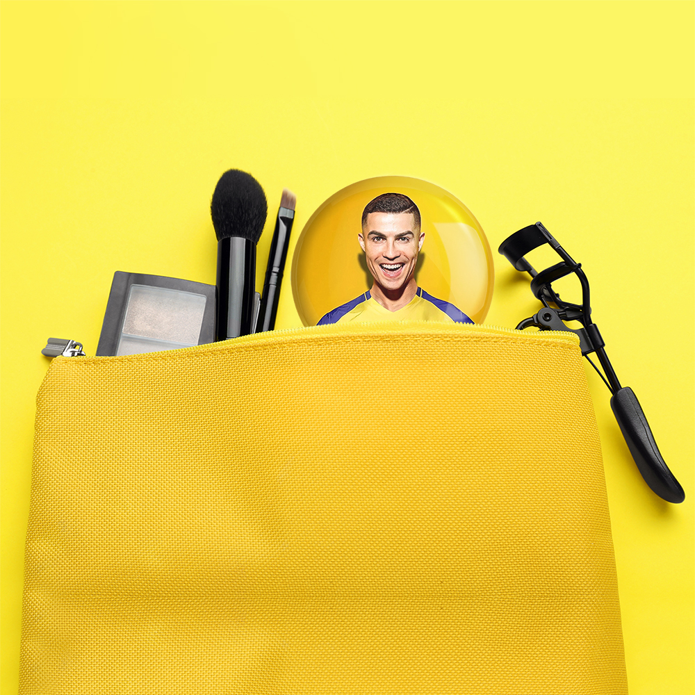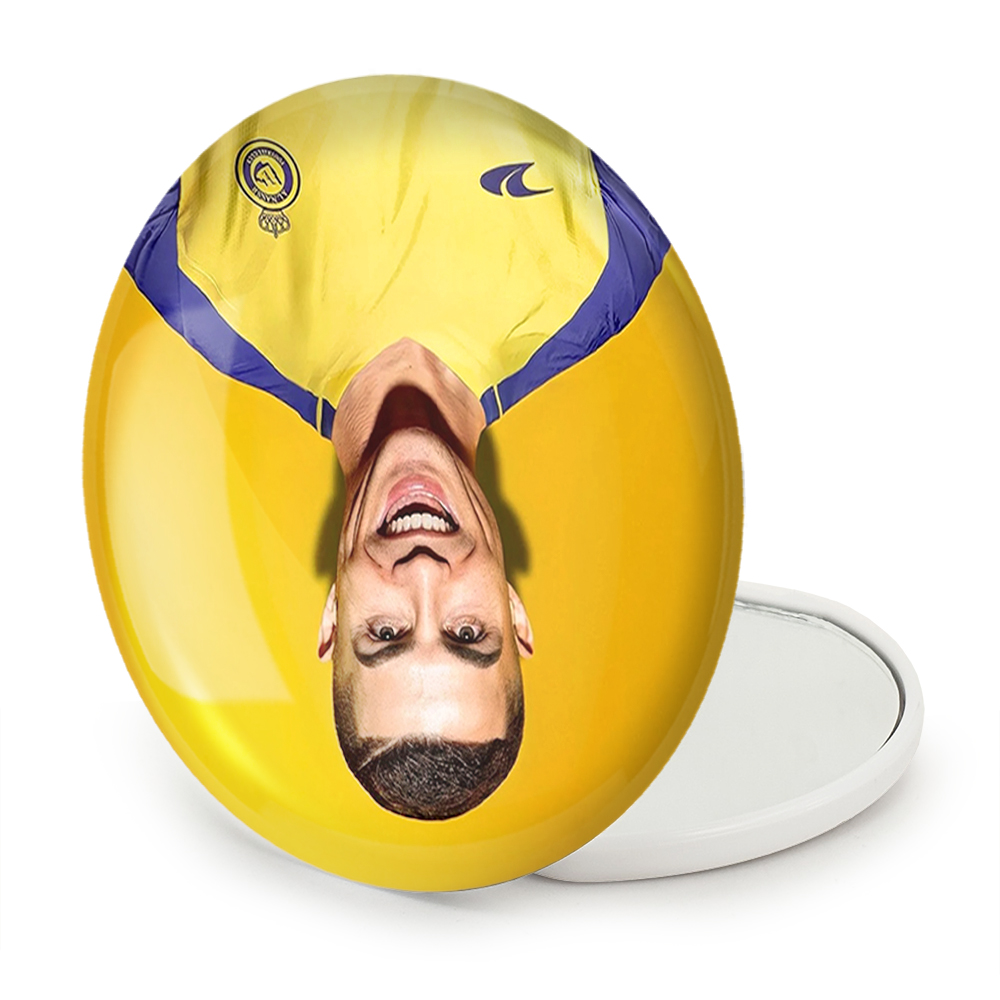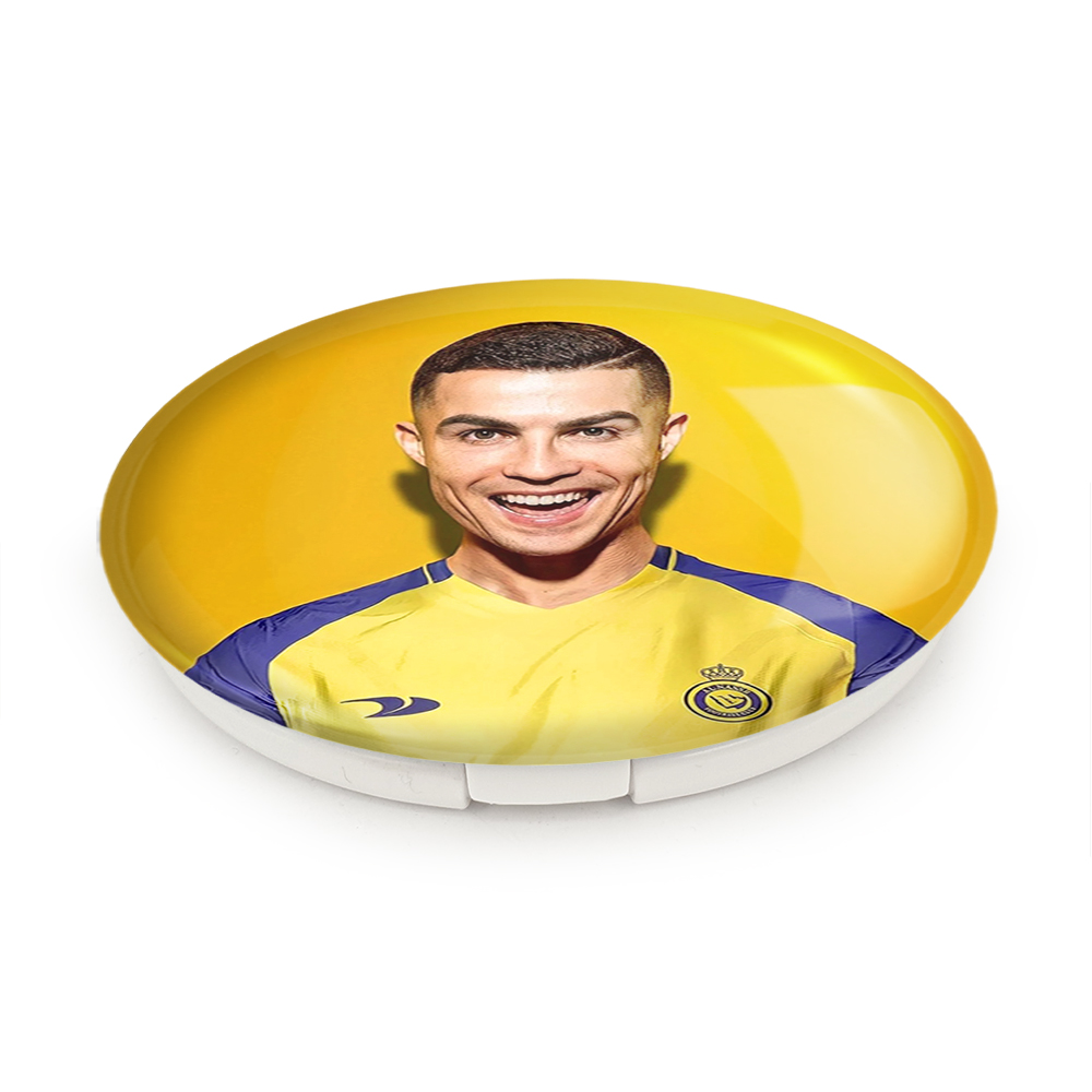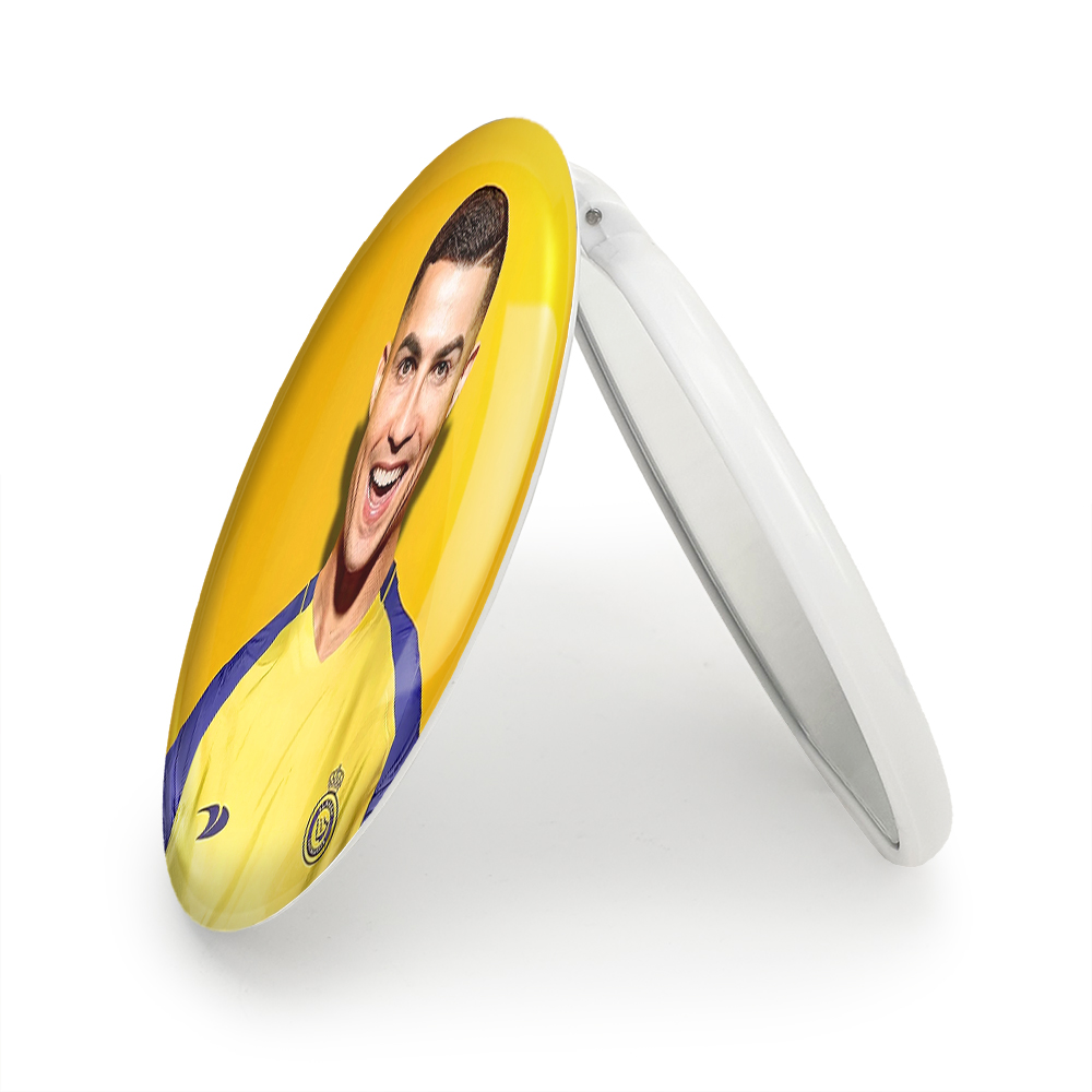 آینه های تاشو کریستیانو رونالدو خندالو، از جنس پلاستیک فشرده ABS تولید شده و به رنگ سفید می باشد. یکی از آینه ها ابعاد واقعی را نشان داده و دیگری با قابلیت بزرگنمایی، جزئیات را بهتر نمایش می دهد. ابعاد هر یک از آینه ها، دایره ای به قطر 7.5 سانت می باشد که نه خیلی بزرگ و غیر قابل استفاده در کیف آرایشی ست و نه خیلی کوچک که تصویر خاصی در آن مشاهده نشود. آینه تاشو کریستیانو رونالدو سایزی استاندارد و کارآمد دارد و در هر کیفی جا میگیرد. چاپ طرح بوسیله چاپگرهای دیجیتال شش رنگ با شفافیت و کیفیتی مثال زدنی بر روی یک وجه از بدنه ی آینه انجام گرفته و با روکش لمینت حرارتی پوشیده شده که در مقابل آسیب و خط و خش مقاوم بوده و کیفیت بالایی دارد. درب آینه بوسیله قفل بدنه ی آن، باز نمی ماند و کاملا بسته می شود و مناسب قرار گیری در کیف لوازم آرایش و کیف های کوچک دستی نیز هست. آینه های تاشو کریستیانو رونالدو خندالو با تنوع طرحی بسیار بالا، سلیقه هر نوع مخاطبی را تامین میکند.