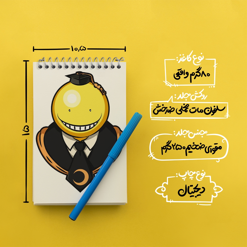 برند خندالو در زمینه تولید انواع دفاتر فانتزی و تحصیلی فعالیت میکند که به دلیل جذابیت ظاهری و طرح های متنوع طرفداران زیادی دارد. دفتر یادداشت خندالو طرح کورو سنسی انیمه کلاس آدمکشی محصولی مناسب برای همه عاشقان لوازم التحریر است و همچنین همه کسانی که بنا به موقعیت تحصیل یا شغلشان با دفتر و نوشت افزار زیاد سر و کار دارند. در تولید دفتر یادداشت خندالو طرح کورو سنسی انیمه کلاس آدمکشی از نوع صحافی فنر مارپیچ استفاده شده که در این نوع صحافی برگه‌ها به راحتی چرخیده و یا بیرون آورده می شوند.