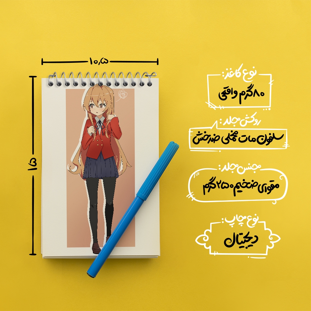 برند خندالو در زمینه تولید انواع دفاتر فانتزی و تحصیلی فعالیت میکند که به دلیل جذابیت ظاهری و طرح های متنوع طرفداران زیادی دارد. دفتر یادداشت خندالو طرح تایگا انیمه تورادورا محصولی مناسب برای همه عاشقان لوازم التحریر است و همچنین همه کسانی که بنا به موقعیت تحصیل یا شغلشان با دفتر و نوشت افزار زیاد سر و کار دارند. در تولید دفتر یادداشت خندالو طرح تایگا انیمه تورادورا از نوع صحافی فنر مارپیچ استفاده شده که در این نوع صحافی برگه‌ها به راحتی چرخیده و یا بیرون آورده می شوند.