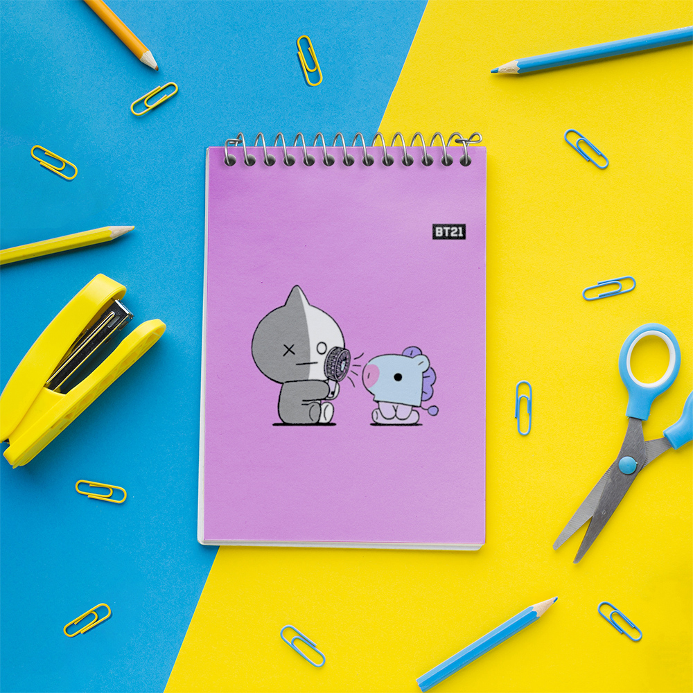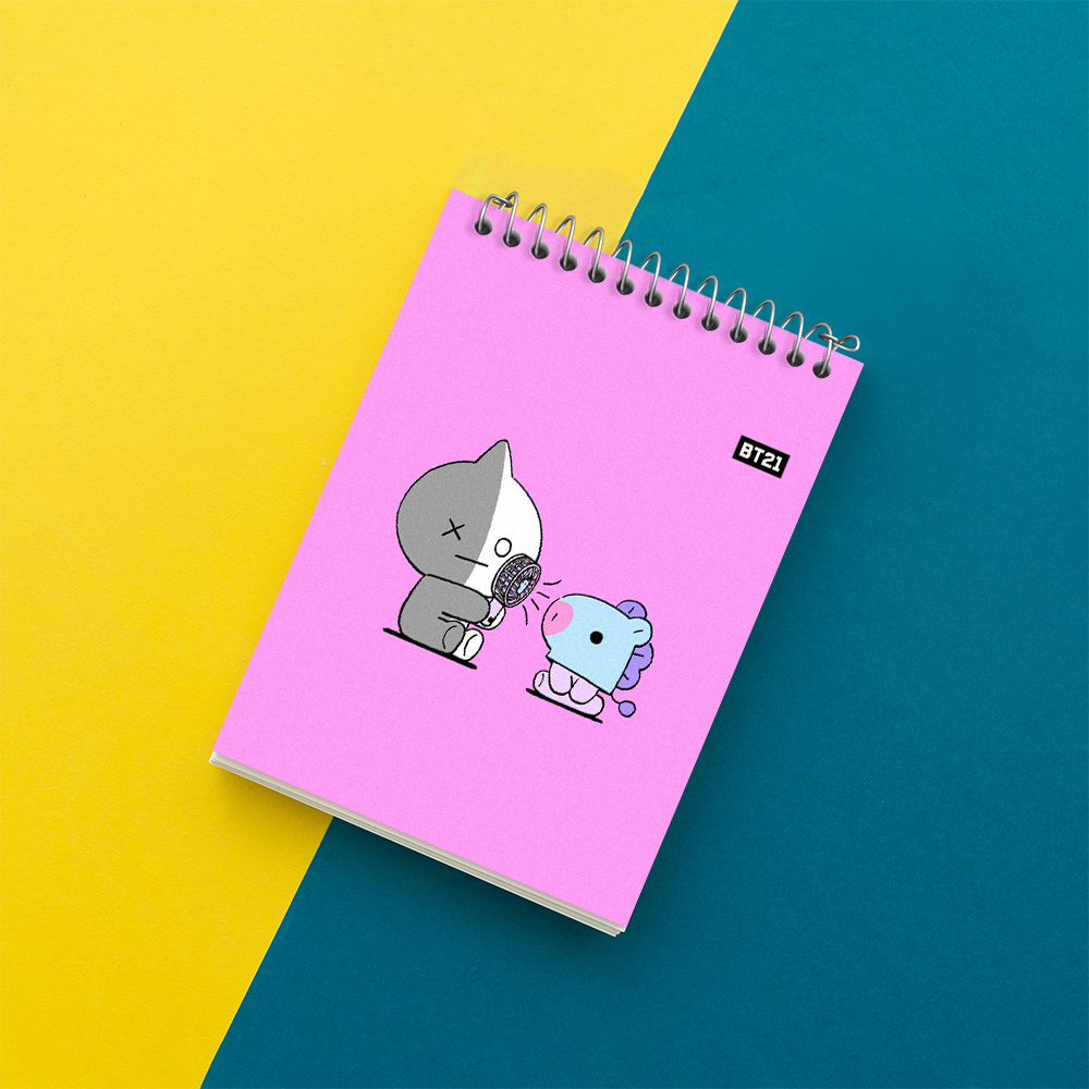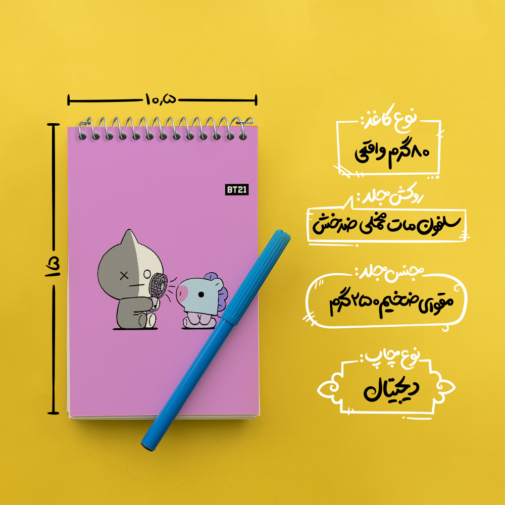 برند خندالو در زمینه تولید انواع دفاتر فانتزی و تحصیلی فعالیت میکند که به دلیل جذابیت ظاهری و طرح های متنوع طرفداران زیادی دارد. دفتر یادداشت خندالو طرح BT21 محصولی مناسب برای همه عاشقان لوازم التحریر است و همچنین همه کسانی که بنا به موقعیت تحصیل یا شغلشان با دفتر و نوشت افزار زیاد سر و کار دارند. در تولید دفتر یادداشت خندالو طرح BT21 از نوع صحافی فنر مارپیچ استفاده شده که در این نوع صحافی برگه‌ها به راحتی چرخیده و یا بیرون آورده می شوند.