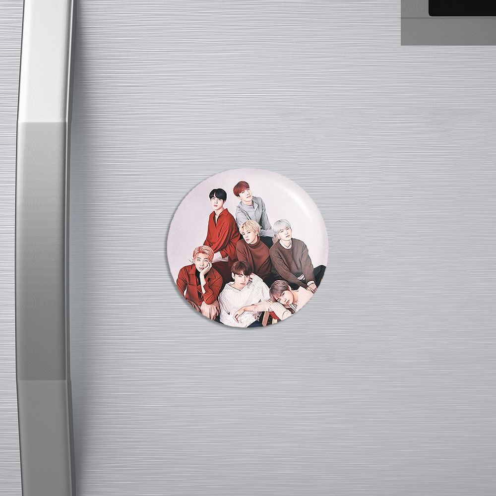 مگنت گروه بی تی اس BTS خندالو با روکش سلفون مات مخملی ضدخش و قطعه پشتی فلزی تولید شده است که آهنربای اتمی بکار برده شده در محصول، بصورت مخفی تعبیه شده ودیده نمی شود. ضمن اینکه گیرایی بسیار بالایی داشته و به هیچ عنوان از روی یخچال نمی افتد.