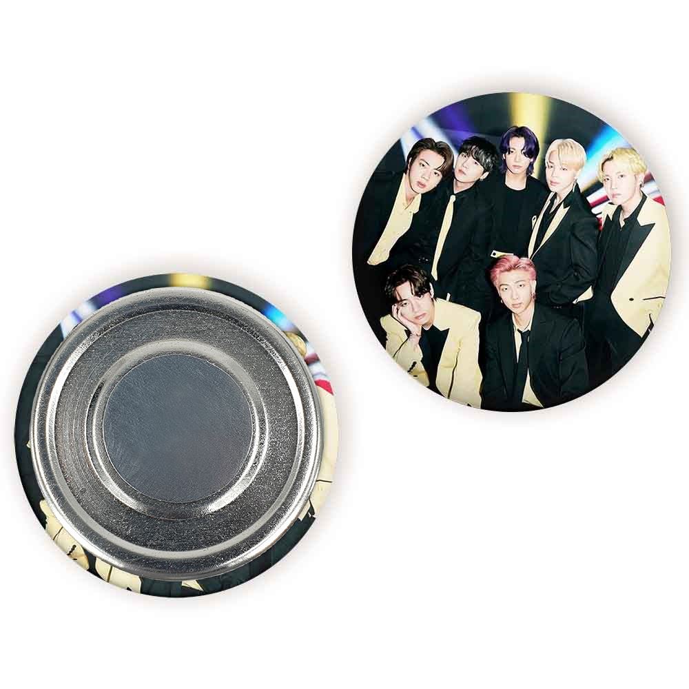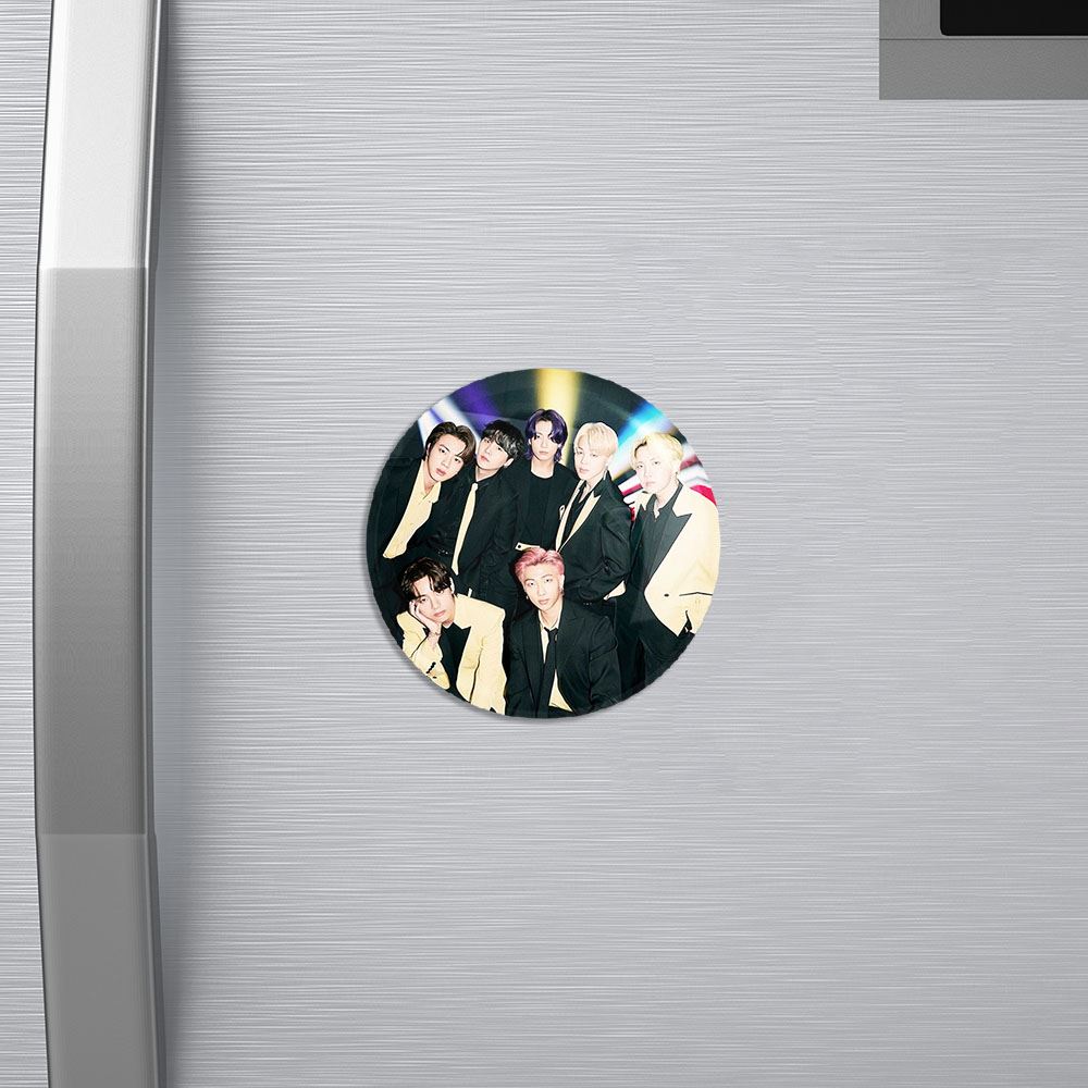 مگنت گروه بی تی اس BTS خندالو با روکش سلفون مات مخملی ضدخش و قطعه پشتی فلزی تولید شده است که آهنربای اتمی بکار برده شده در محصول، بصورت مخفی تعبیه شده ودیده نمی شود. ضمن اینکه گیرایی بسیار بالایی داشته و به هیچ عنوان از روی یخچال نمی افتد.