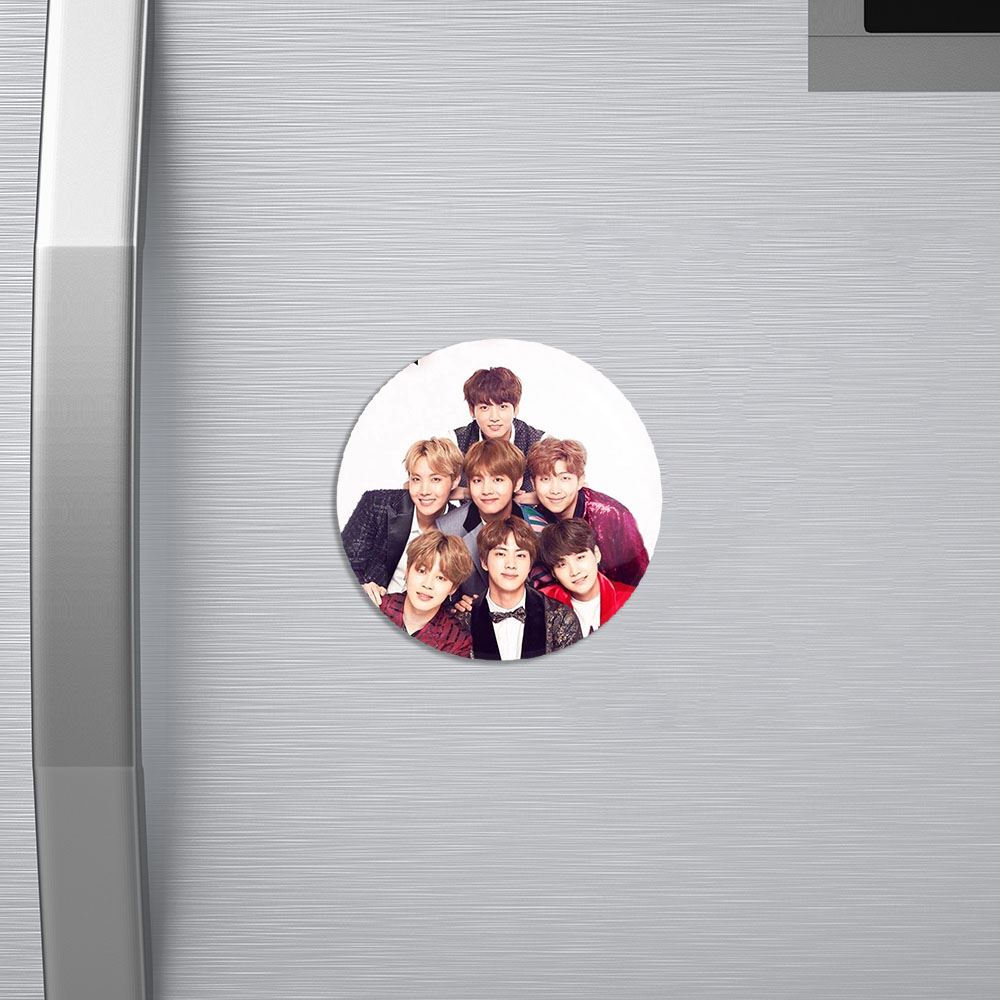 مگنت گروه بی تی اس BTS خندالو با روکش سلفون مات مخملی ضدخش و قطعه پشتی فلزی تولید شده است که آهنربای اتمی بکار برده شده در محصول، بصورت مخفی تعبیه شده ودیده نمی شود. ضمن اینکه گیرایی بسیار بالایی داشته و به هیچ عنوان از روی یخچال نمی افتد.