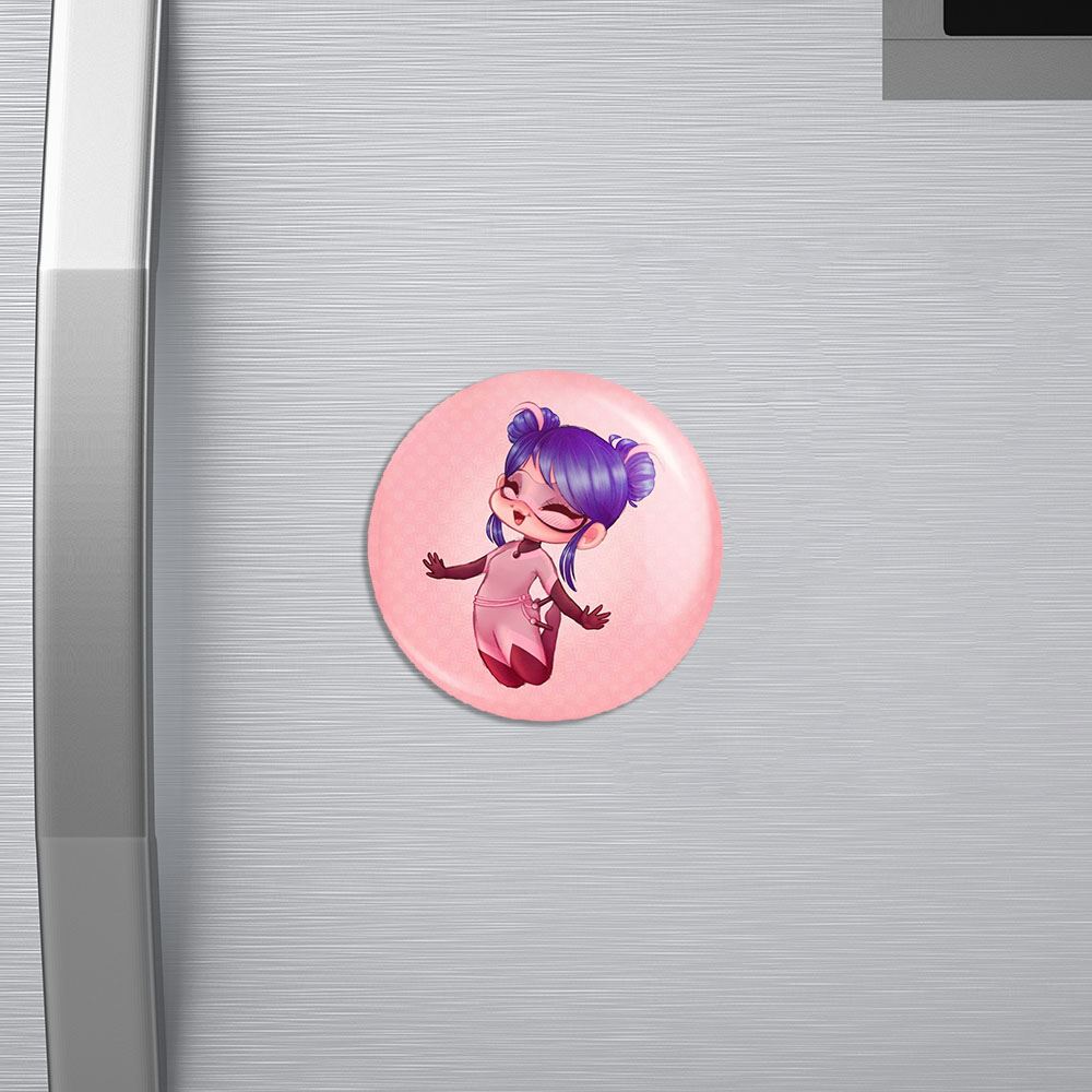 مگنت دختر کفشدوزکی خندالو با روکش سلفون مات مخملی ضدخش و قطعه پشتی فلزی تولید شده است که آهنربای اتمی بکار برده شده در محصول، بصورت مخفی تعبیه شده ودیده نمی شود. ضمن اینکه گیرایی بسیار بالایی داشته و به هیچ عنوان از روی یخچال نمی افتد.