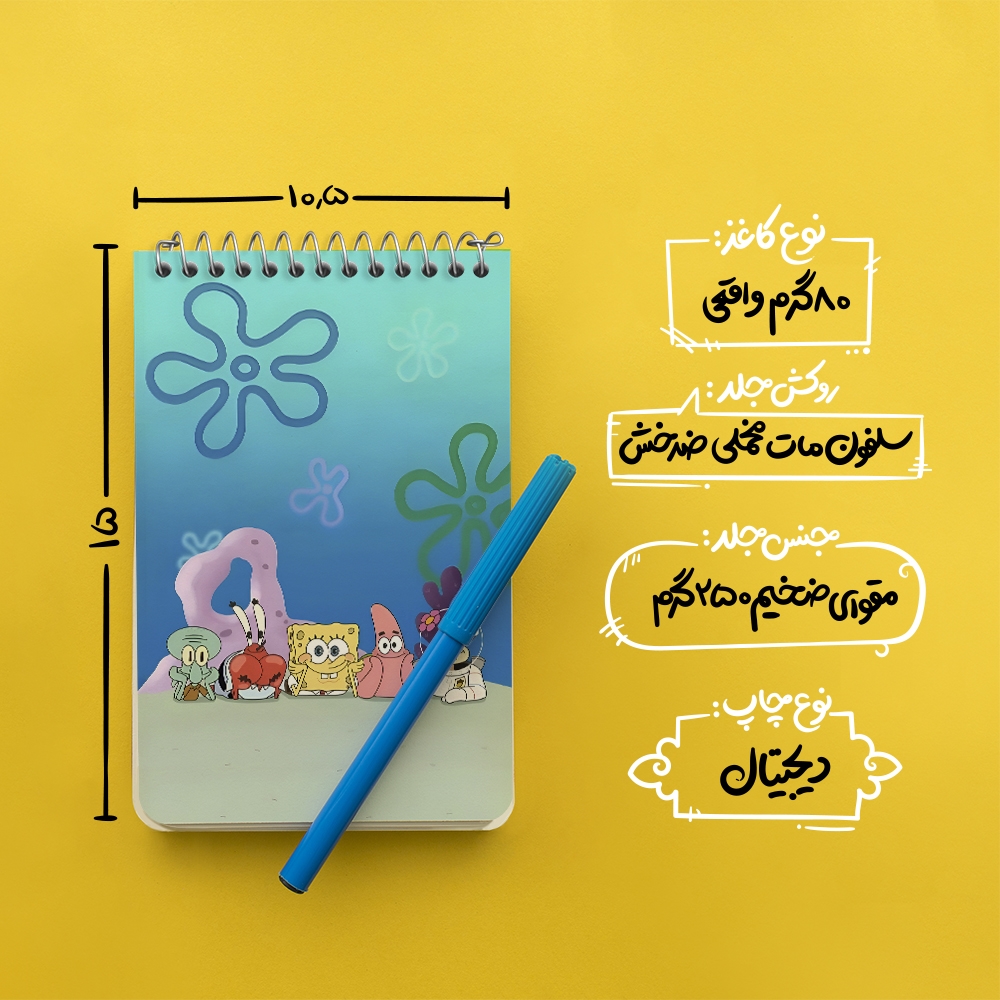 برند خندالو در زمینه تولید انواع دفاتر فانتزی و تحصیلی فعالیت میکند که به دلیل جذابیت ظاهری و طرح های متنوع طرفداران زیادی دارد. دفتر یادداشت خندالو طرح باب اسفنجی و پاتریک محصولی مناسب برای همه عاشقان لوازم التحریر است و همچنین همه کسانی که بنا به موقعیت تحصیل یا شغلشان با دفتر و نوشت افزار زیاد سر و کار دارند. در تولید دفتر یادداشت خندالو طرح باب اسفنجی و پاتریک از نوع صحافی فنر مارپیچ استفاده شده که در این نوع صحافی برگه‌ها به راحتی چرخیده و یا بیرون آورده می شوند.