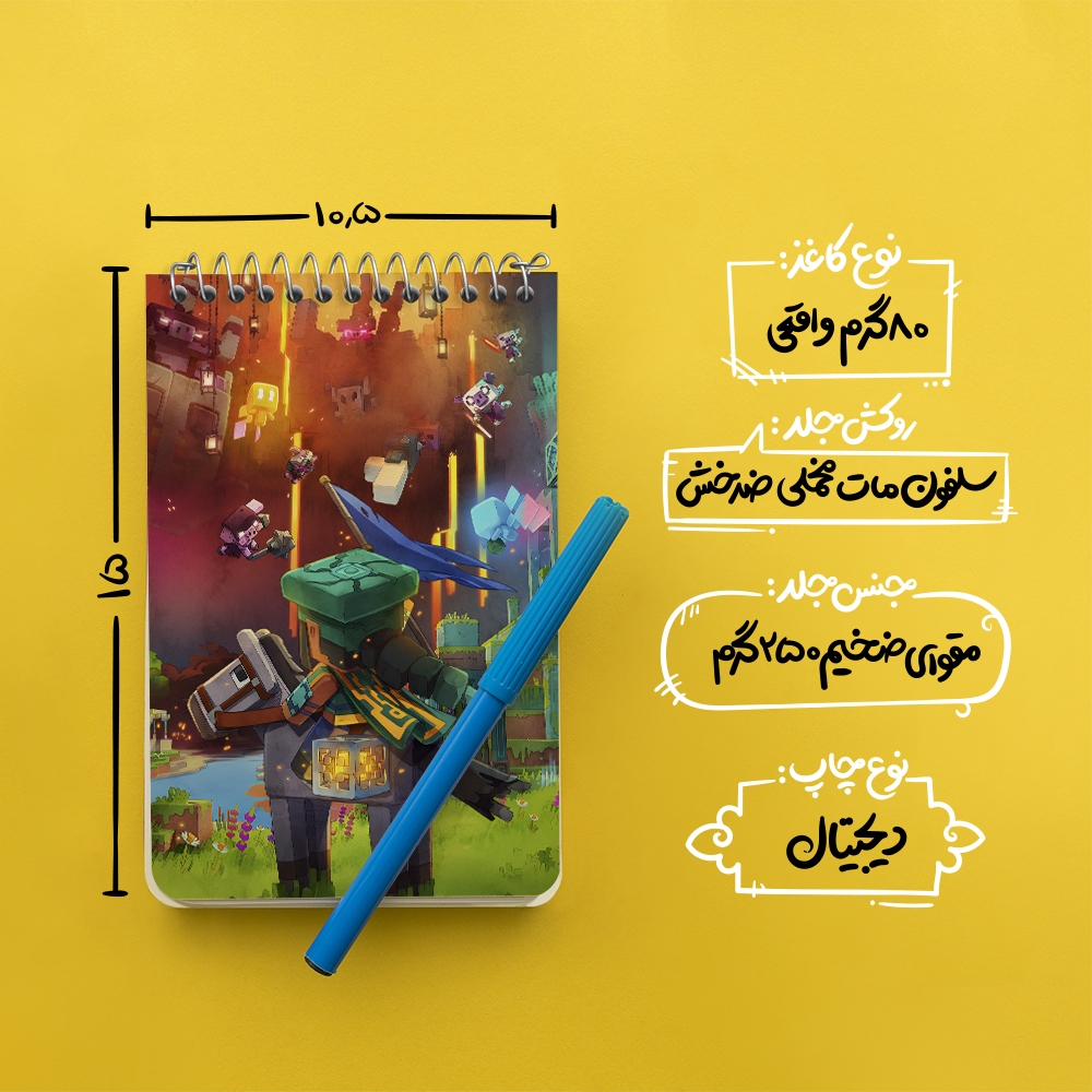 برند خندالو در زمینه تولید انواع دفاتر فانتزی و تحصیلی فعالیت میکند که به دلیل جذابیت ظاهری و طرح های متنوع طرفداران زیادی دارد. دفتر یادداشت خندالو طرح ماینکرافت (Minecraft) محصولی مناسب برای همه عاشقان لوازم التحریر است و همچنین همه کسانی که بنا به موقعیت تحصیل یا شغلشان با دفتر و نوشت افزار زیاد سر و کار دارند. در تولید دفتر یادداشت خندالو طرح ماینکرافت (Minecraft) از نوع صحافی فنر مارپیچ استفاده شده که در این نوع صحافی برگه‌ها به راحتی چرخیده و یا بیرون آورده می شوند.