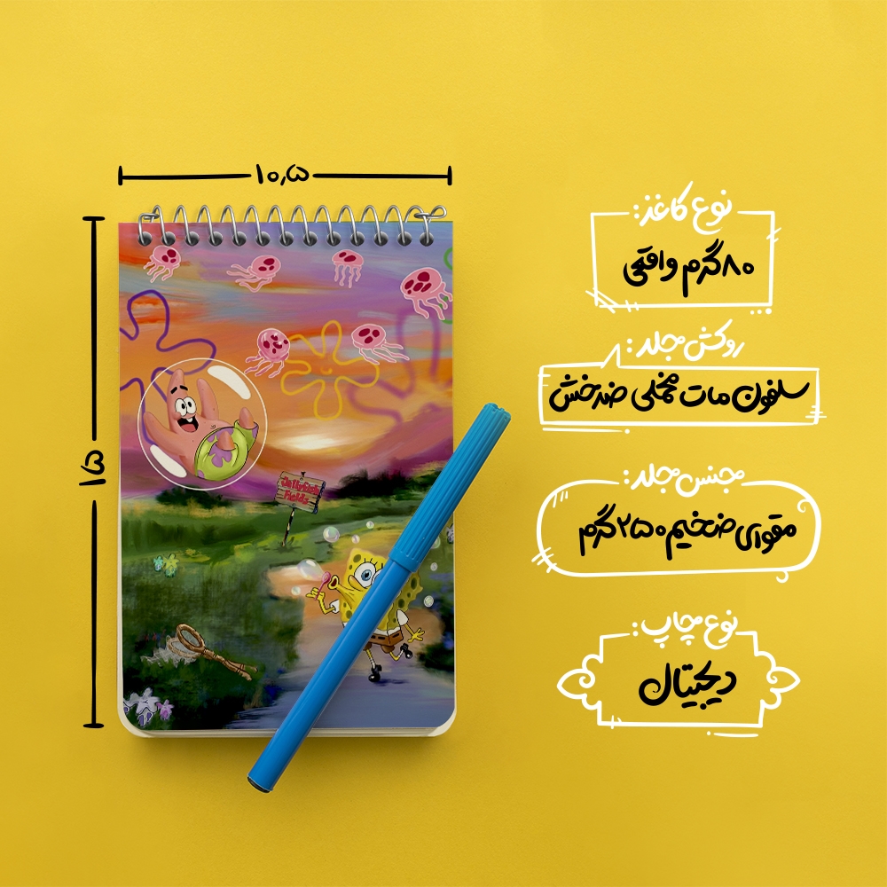 برند خندالو در زمینه تولید انواع دفاتر فانتزی و تحصیلی فعالیت میکند که به دلیل جذابیت ظاهری و طرح های متنوع طرفداران زیادی دارد. دفتر یادداشت خندالو طرح باب اسفنجی و پاتریک محصولی مناسب برای همه عاشقان لوازم التحریر است و همچنین همه کسانی که بنا به موقعیت تحصیل یا شغلشان با دفتر و نوشت افزار زیاد سر و کار دارند. در تولید دفتر یادداشت خندالو طرح باب اسفنجی و پاتریک از نوع صحافی فنر مارپیچ استفاده شده که در این نوع صحافی برگه‌ها به راحتی چرخیده و یا بیرون آورده می شوند.