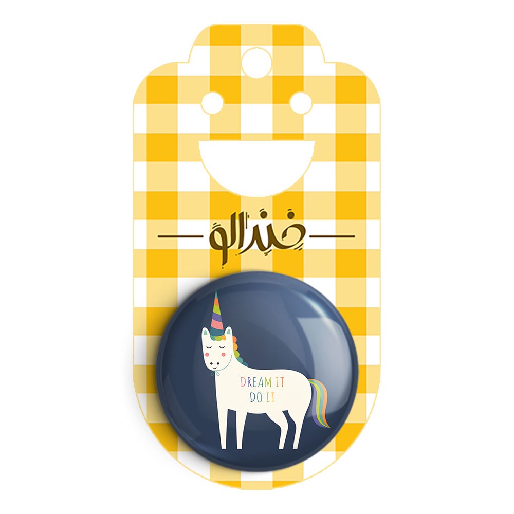 پیکسل 44 میلی متری اسب تک شاخ یونیکورن خندالو با روکش سلفون حرارتی مات مخملی ضدخش و قطعه پشتی رنگی تولید شده است.پلاستیکی پشت پیکسل با سوزن یک تکه ثابت و بدون لغزش و جا به جایی، ایستایی بسیار بهتری نسبت به پشتی فلزی پیکسل دارند که این مهم در تولید این محصول نیز رعایت شده است.