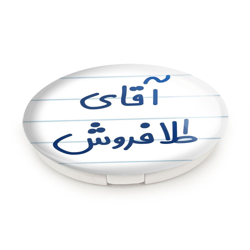 آینه های تاشو آقای طلافروش خندالو، از جنس پلاستیک فشرده ABS تولید شده و به رنگ سفید می باشد. یکی از آینه ها ابعاد واقعی را نشان داده و دیگری با قابلیت بزرگنمایی، جزئیات را بهتر نمایش می دهد. ابعاد هر یک از آینه ها، دایره ای به قطر 7.5 سانت می باشد که نه خیلی بزرگ و غیر قابل استفاده در کیف آرایشی ست و نه خیلی کوچک که تصویر خاصی در آن مشاهده نشود. آینه تاشو آقای طلافروش سایزی استاندارد و کارآمد دارد و در هر کیفی جا میگیرد. چاپ طرح بوسیله چاپگرهای دیجیتال شش رنگ با شفافیت و کیفیتی مثال زدنی بر روی یک وجه از بدنه ی آینه انجام گرفته و با روکش لمینت حرارتی پوشیده شده که در مقابل آسیب و خط و خش مقاوم بوده و کیفیت بالایی دارد. درب آینه بوسیله قفل بدنه ی آن، باز نمی ماند و کاملا بسته می شود و مناسب قرار گیری در کیف لوازم آرایش و کیف های کوچک دستی نیز هست. آینه های تاشو آقای طلافروش خندالو با تنوع طرحی بسیار بالا، سلیقه هر نوع مخاطبی را تامین میکند.