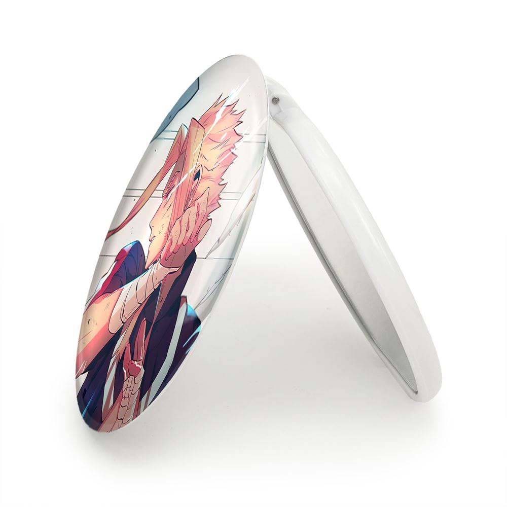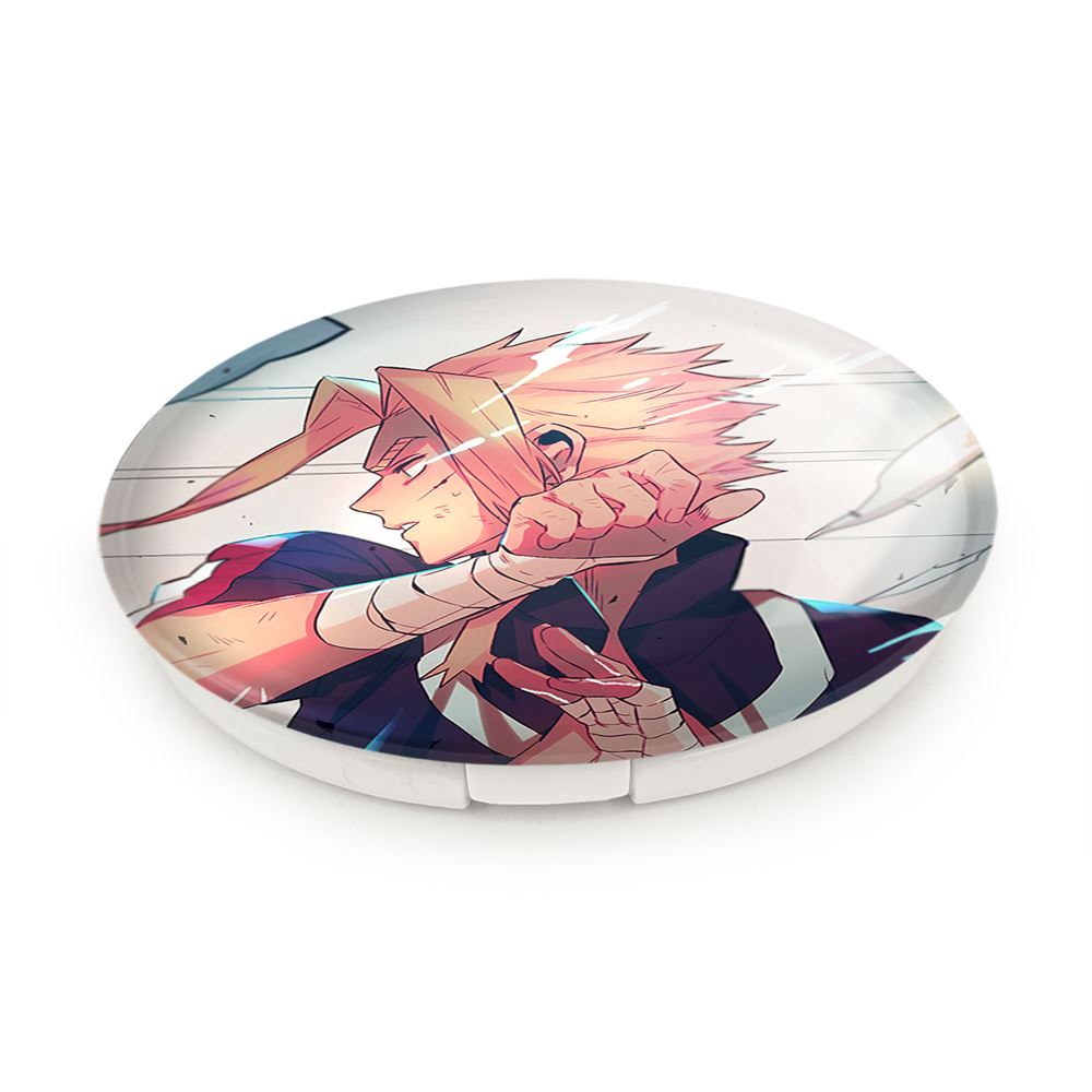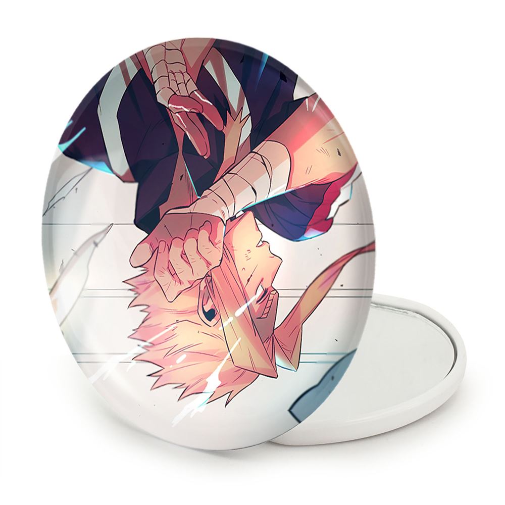 آینه های تاشو آلمایت انیمه آکادمی قهرمان من خندالو، از جنس پلاستیک فشرده ABS تولید شده و به رنگ سفید می باشد. یکی از آینه ها ابعاد واقعی را نشان داده و دیگری با قابلیت بزرگنمایی، جزئیات را بهتر نمایش می دهد. ابعاد هر یک از آینه ها، دایره ای به قطر 7.5 سانت می باشد که نه خیلی بزرگ و غیر قابل استفاده در کیف آرایشی ست و نه خیلی کوچک که تصویر خاصی در آن مشاهده نشود. آینه تاشو آلمایت انیمه آکادمی قهرمان من سایزی استاندارد و کارآمد دارد و در هر کیفی جا میگیرد. چاپ طرح بوسیله چاپگرهای دیجیتال شش رنگ با شفافیت و کیفیتی مثال زدنی بر روی یک وجه از بدنه ی آینه انجام گرفته و با روکش لمینت حرارتی پوشیده شده که در مقابل آسیب و خط و خش مقاوم بوده و کیفیت بالایی دارد. درب آینه بوسیله قفل بدنه ی آن، باز نمی ماند و کاملا بسته می شود و مناسب قرار گیری در کیف لوازم آرایش و کیف های کوچک دستی نیز هست. آینه های تاشو آلمایت انیمه آکادمی قهرمان من خندالو با تنوع طرحی بسیار بالا، سلیقه هر نوع مخاطبی را تامین میکند.