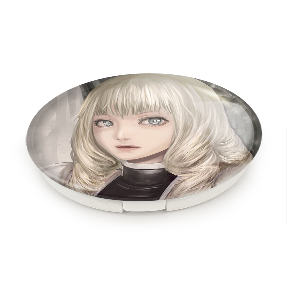 آینه های تاشو آناستازیا انیمه کلیمور خندالو، از جنس پلاستیک فشرده ABS تولید شده و به رنگ سفید می باشد. یکی از آینه ها ابعاد واقعی را نشان داده و دیگری با قابلیت بزرگنمایی، جزئیات را بهتر نمایش می دهد. ابعاد هر یک از آینه ها، دایره ای به قطر 7.5 سانت می باشد که نه خیلی بزرگ و غیر قابل استفاده در کیف آرایشی ست و نه خیلی کوچک که تصویر خاصی در آن مشاهده نشود. آینه تاشو آناستازیا انیمه کلیمور سایزی استاندارد و کارآمد دارد و در هر کیفی جا میگیرد. چاپ طرح بوسیله چاپگرهای دیجیتال شش رنگ با شفافیت و کیفیتی مثال زدنی بر روی یک وجه از بدنه ی آینه انجام گرفته و با روکش لمینت حرارتی پوشیده شده که در مقابل آسیب و خط و خش مقاوم بوده و کیفیت بالایی دارد. درب آینه بوسیله قفل بدنه ی آن، باز نمی ماند و کاملا بسته می شود و مناسب قرار گیری در کیف لوازم آرایش و کیف های کوچک دستی نیز هست. آینه های تاشو آناستازیا انیمه کلیمور خندالو با تنوع طرحی بسیار بالا، سلیقه هر نوع مخاطبی را تامین میکند.