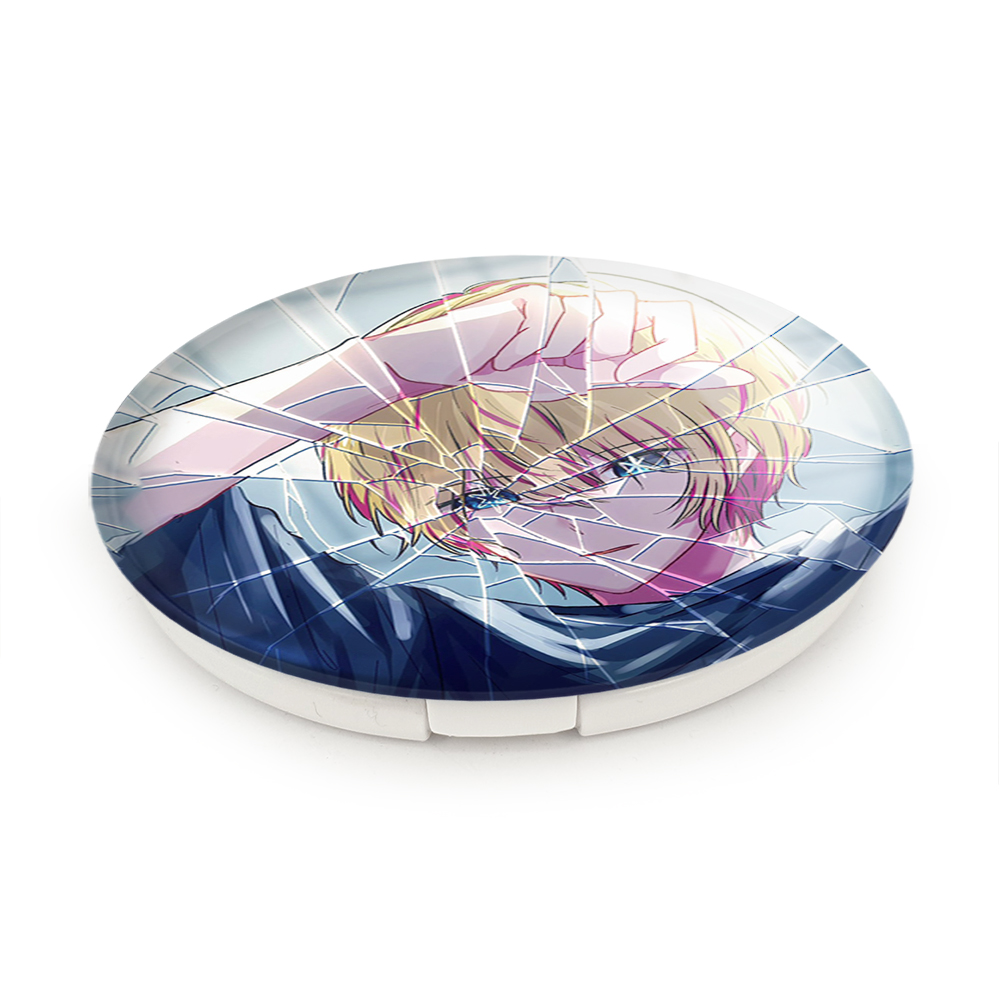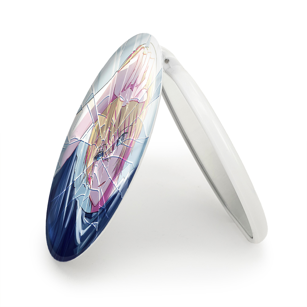 آینه های تاشو آکوا انیمه اوشی نو کو خندالو، از جنس پلاستیک فشرده ABS تولید شده و به رنگ سفید می باشد. یکی از آینه ها ابعاد واقعی را نشان داده و دیگری با قابلیت بزرگنمایی، جزئیات را بهتر نمایش می دهد. ابعاد هر یک از آینه ها، دایره ای به قطر 7.5 سانت می باشد که نه خیلی بزرگ و غیر قابل استفاده در کیف آرایشی ست و نه خیلی کوچک که تصویر خاصی در آن مشاهده نشود. آینه تاشو آکوا انیمه اوشی نو کو سایزی استاندارد و کارآمد دارد و در هر کیفی جا میگیرد. چاپ طرح بوسیله چاپگرهای دیجیتال شش رنگ با شفافیت و کیفیتی مثال زدنی بر روی یک وجه از بدنه ی آینه انجام گرفته و با روکش لمینت حرارتی پوشیده شده که در مقابل آسیب و خط و خش مقاوم بوده و کیفیت بالایی دارد. درب آینه بوسیله قفل بدنه ی آن، باز نمی ماند و کاملا بسته می شود و مناسب قرار گیری در کیف لوازم آرایش و کیف های کوچک دستی نیز هست. آینه های تاشو آکوا انیمه اوشی نو کو خندالو با تنوع طرحی بسیار بالا، سلیقه هر نوع مخاطبی را تامین میکند.