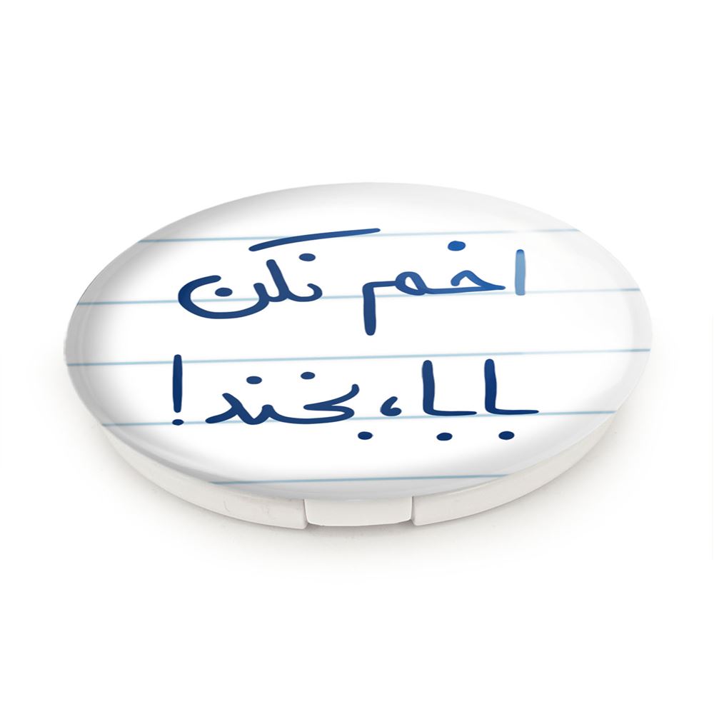 آینه های تاشو اخم نکن بابا بخند خندالو، از جنس پلاستیک فشرده ABS تولید شده و به رنگ سفید می باشد. یکی از آینه ها ابعاد واقعی را نشان داده و دیگری با قابلیت بزرگنمایی، جزئیات را بهتر نمایش می دهد. ابعاد هر یک از آینه ها، دایره ای به قطر 7.5 سانت می باشد که نه خیلی بزرگ و غیر قابل استفاده در کیف آرایشی ست و نه خیلی کوچک که تصویر خاصی در آن مشاهده نشود. آینه تاشو اخم نکن بابا بخند سایزی استاندارد و کارآمد دارد و در هر کیفی جا میگیرد. چاپ طرح بوسیله چاپگرهای دیجیتال شش رنگ با شفافیت و کیفیتی مثال زدنی بر روی یک وجه از بدنه ی آینه انجام گرفته و با روکش لمینت حرارتی پوشیده شده که در مقابل آسیب و خط و خش مقاوم بوده و کیفیت بالایی دارد. درب آینه بوسیله قفل بدنه ی آن، باز نمی ماند و کاملا بسته می شود و مناسب قرار گیری در کیف لوازم آرایش و کیف های کوچک دستی نیز هست. آینه های تاشو اخم نکن بابا بخند خندالو با تنوع طرحی بسیار بالا، سلیقه هر نوع مخاطبی را تامین میکند.