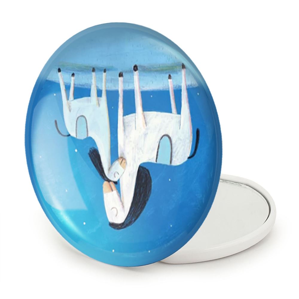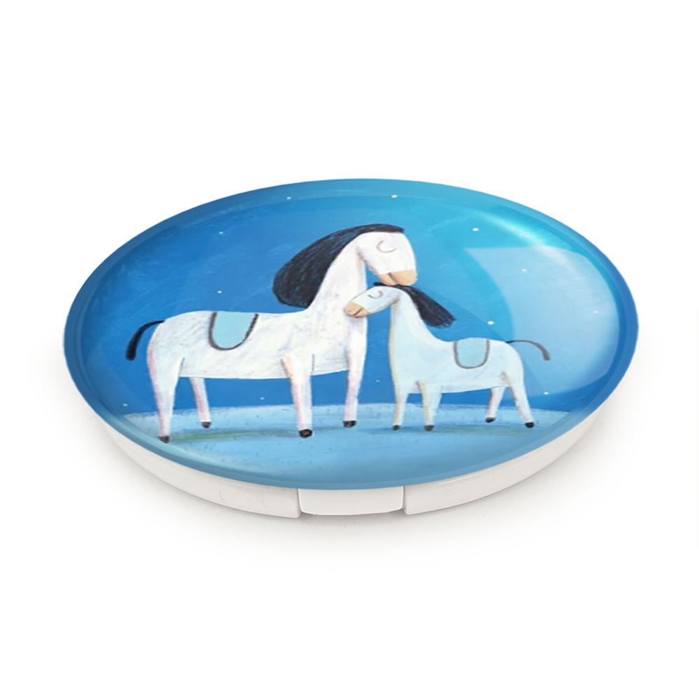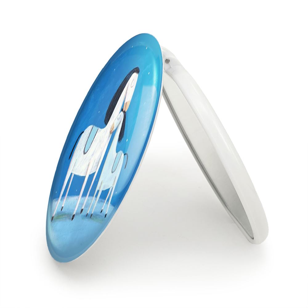 آینه های تاشو اسب خندالو، از جنس پلاستیک فشرده ABS تولید شده و به رنگ سفید می باشد. یکی از آینه ها ابعاد واقعی را نشان داده و دیگری با قابلیت بزرگنمایی، جزئیات را بهتر نمایش می دهد. ابعاد هر یک از آینه ها، دایره ای به قطر 7.5 سانت می باشد که نه خیلی بزرگ و غیر قابل استفاده در کیف آرایشی ست و نه خیلی کوچک که تصویر خاصی در آن مشاهده نشود. آینه تاشو اسب سایزی استاندارد و کارآمد دارد و در هر کیفی جا میگیرد. چاپ طرح بوسیله چاپگرهای دیجیتال شش رنگ با شفافیت و کیفیتی مثال زدنی بر روی یک وجه از بدنه ی آینه انجام گرفته و با روکش لمینت حرارتی پوشیده شده که در مقابل آسیب و خط و خش مقاوم بوده و کیفیت بالایی دارد. درب آینه بوسیله قفل بدنه ی آن، باز نمی ماند و کاملا بسته می شود و مناسب قرار گیری در کیف لوازم آرایش و کیف های کوچک دستی نیز هست. آینه های تاشو اسب خندالو با تنوع طرحی بسیار بالا، سلیقه هر نوع مخاطبی را تامین میکند.