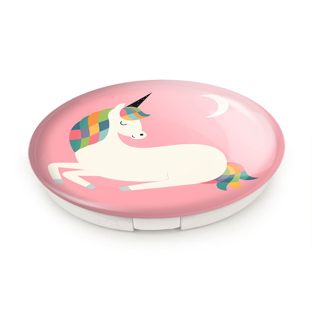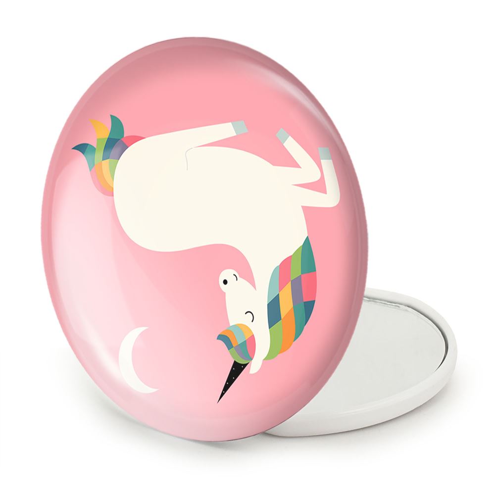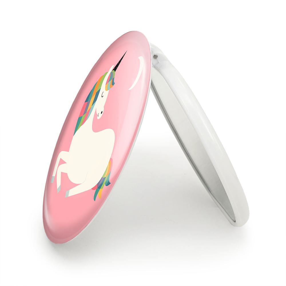 آینه های تاشو اسب تک شاخ یونیکورن خندالو، از جنس پلاستیک فشرده ABS تولید شده و به رنگ سفید می باشد. یکی از آینه ها ابعاد واقعی را نشان داده و دیگری با قابلیت بزرگنمایی، جزئیات را بهتر نمایش می دهد. ابعاد هر یک از آینه ها، دایره ای به قطر 7.5 سانت می باشد که نه خیلی بزرگ و غیر قابل استفاده در کیف آرایشی ست و نه خیلی کوچک که تصویر خاصی در آن مشاهده نشود. آینه تاشو اسب تک شاخ یونیکورن سایزی استاندارد و کارآمد دارد و در هر کیفی جا میگیرد. چاپ طرح بوسیله چاپگرهای دیجیتال شش رنگ با شفافیت و کیفیتی مثال زدنی بر روی یک وجه از بدنه ی آینه انجام گرفته و با روکش لمینت حرارتی پوشیده شده که در مقابل آسیب و خط و خش مقاوم بوده و کیفیت بالایی دارد. درب آینه بوسیله قفل بدنه ی آن، باز نمی ماند و کاملا بسته می شود و مناسب قرار گیری در کیف لوازم آرایش و کیف های کوچک دستی نیز هست. آینه های تاشو اسب تک شاخ یونیکورن خندالو با تنوع طرحی بسیار بالا، سلیقه هر نوع مخاطبی را تامین میکند.