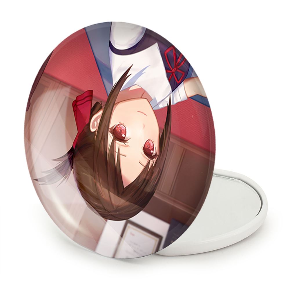 آینه های تاشو انیمه کاگویا ساما خندالو، از جنس پلاستیک فشرده ABS تولید شده و به رنگ سفید می باشد. یکی از آینه ها ابعاد واقعی را نشان داده و دیگری با قابلیت بزرگنمایی، جزئیات را بهتر نمایش می دهد. ابعاد هر یک از آینه ها، دایره ای به قطر 7.5 سانت می باشد که نه خیلی بزرگ و غیر قابل استفاده در کیف آرایشی ست و نه خیلی کوچک که تصویر خاصی در آن مشاهده نشود. آینه تاشو انیمه کاگویا ساما سایزی استاندارد و کارآمد دارد و در هر کیفی جا میگیرد. چاپ طرح بوسیله چاپگرهای دیجیتال شش رنگ با شفافیت و کیفیتی مثال زدنی بر روی یک وجه از بدنه ی آینه انجام گرفته و با روکش لمینت حرارتی پوشیده شده که در مقابل آسیب و خط و خش مقاوم بوده و کیفیت بالایی دارد. درب آینه بوسیله قفل بدنه ی آن، باز نمی ماند و کاملا بسته می شود و مناسب قرار گیری در کیف لوازم آرایش و کیف های کوچک دستی نیز هست. آینه های تاشو انیمه کاگویا ساما خندالو با تنوع طرحی بسیار بالا، سلیقه هر نوع مخاطبی را تامین میکند.