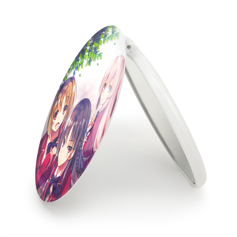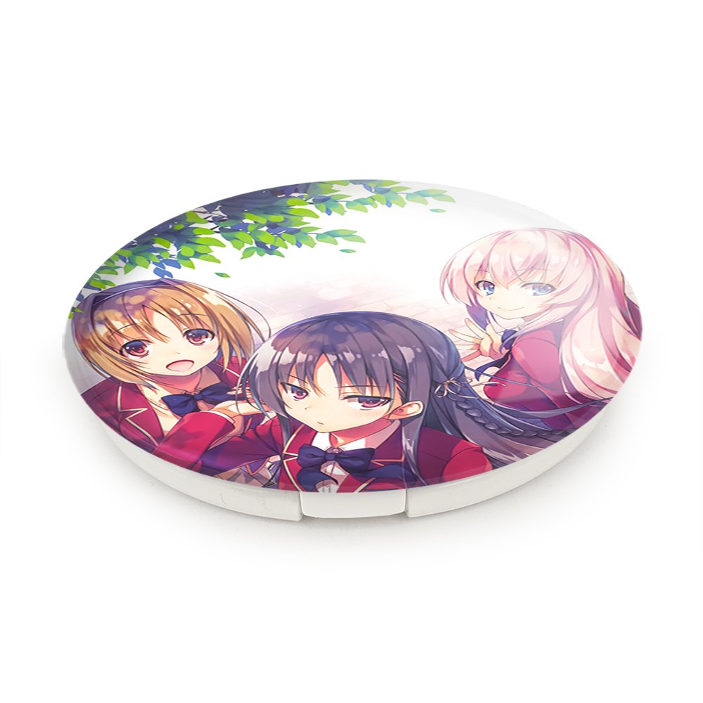 آینه های تاشو انیمه کلاس نخبگان (Classroom Elite) خندالو، از جنس پلاستیک فشرده ABS تولید شده و به رنگ سفید می باشد. یکی از آینه ها ابعاد واقعی را نشان داده و دیگری با قابلیت بزرگنمایی، جزئیات را بهتر نمایش می دهد. ابعاد هر یک از آینه ها، دایره ای به قطر 7.5 سانت می باشد که نه خیلی بزرگ و غیر قابل استفاده در کیف آرایشی ست و نه خیلی کوچک که تصویر خاصی در آن مشاهده نشود. آینه تاشو انیمه کلاس نخبگان (Classroom Elite) سایزی استاندارد و کارآمد دارد و در هر کیفی جا میگیرد. چاپ طرح بوسیله چاپگرهای دیجیتال شش رنگ با شفافیت و کیفیتی مثال زدنی بر روی یک وجه از بدنه ی آینه انجام گرفته و با روکش لمینت حرارتی پوشیده شده که در مقابل آسیب و خط و خش مقاوم بوده و کیفیت بالایی دارد. درب آینه بوسیله قفل بدنه ی آن، باز نمی ماند و کاملا بسته می شود و مناسب قرار گیری در کیف لوازم آرایش و کیف های کوچک دستی نیز هست. آینه های تاشو انیمه کلاس نخبگان (Classroom Elite) خندالو با تنوع طرحی بسیار بالا، سلیقه هر نوع مخاطبی را تامین میکند.