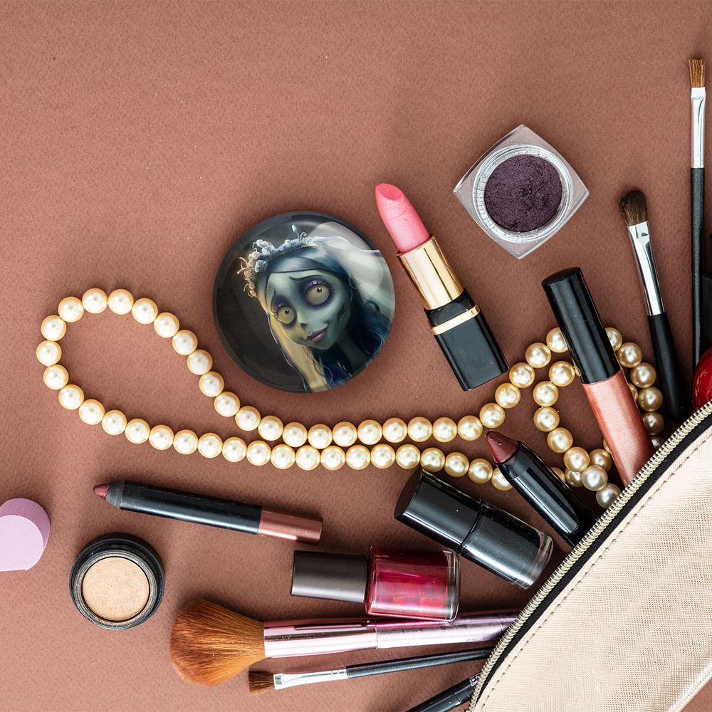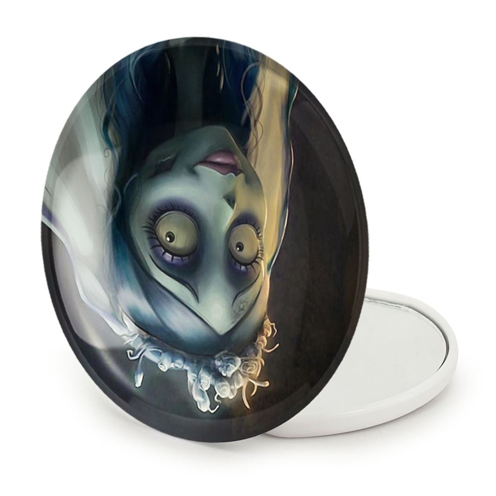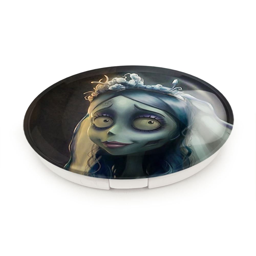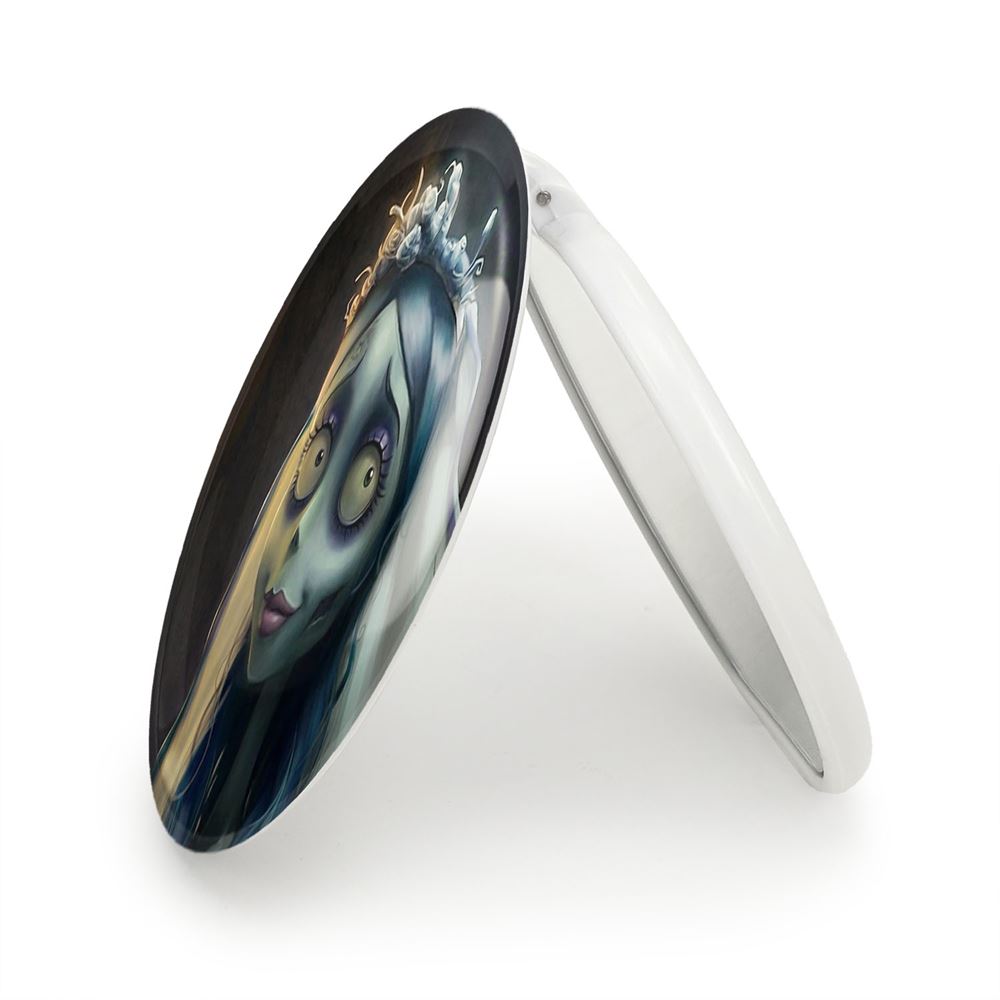 آینه های تاشو انیمیشن عروس مردگان خندالو، از جنس پلاستیک فشرده ABS تولید شده و به رنگ سفید می باشد. یکی از آینه ها ابعاد واقعی را نشان داده و دیگری با قابلیت بزرگنمایی، جزئیات را بهتر نمایش می دهد. ابعاد هر یک از آینه ها، دایره ای به قطر 7.5 سانت می باشد که نه خیلی بزرگ و غیر قابل استفاده در کیف آرایشی ست و نه خیلی کوچک که تصویر خاصی در آن مشاهده نشود. آینه تاشو انیمیشن عروس مردگان سایزی استاندارد و کارآمد دارد و در هر کیفی جا میگیرد. چاپ طرح بوسیله چاپگرهای دیجیتال شش رنگ با شفافیت و کیفیتی مثال زدنی بر روی یک وجه از بدنه ی آینه انجام گرفته و با روکش لمینت حرارتی پوشیده شده که در مقابل آسیب و خط و خش مقاوم بوده و کیفیت بالایی دارد. درب آینه بوسیله قفل بدنه ی آن، باز نمی ماند و کاملا بسته می شود و مناسب قرار گیری در کیف لوازم آرایش و کیف های کوچک دستی نیز هست. آینه های تاشو انیمیشن عروس مردگان خندالو با تنوع طرحی بسیار بالا، سلیقه هر نوع مخاطبی را تامین میکند.
