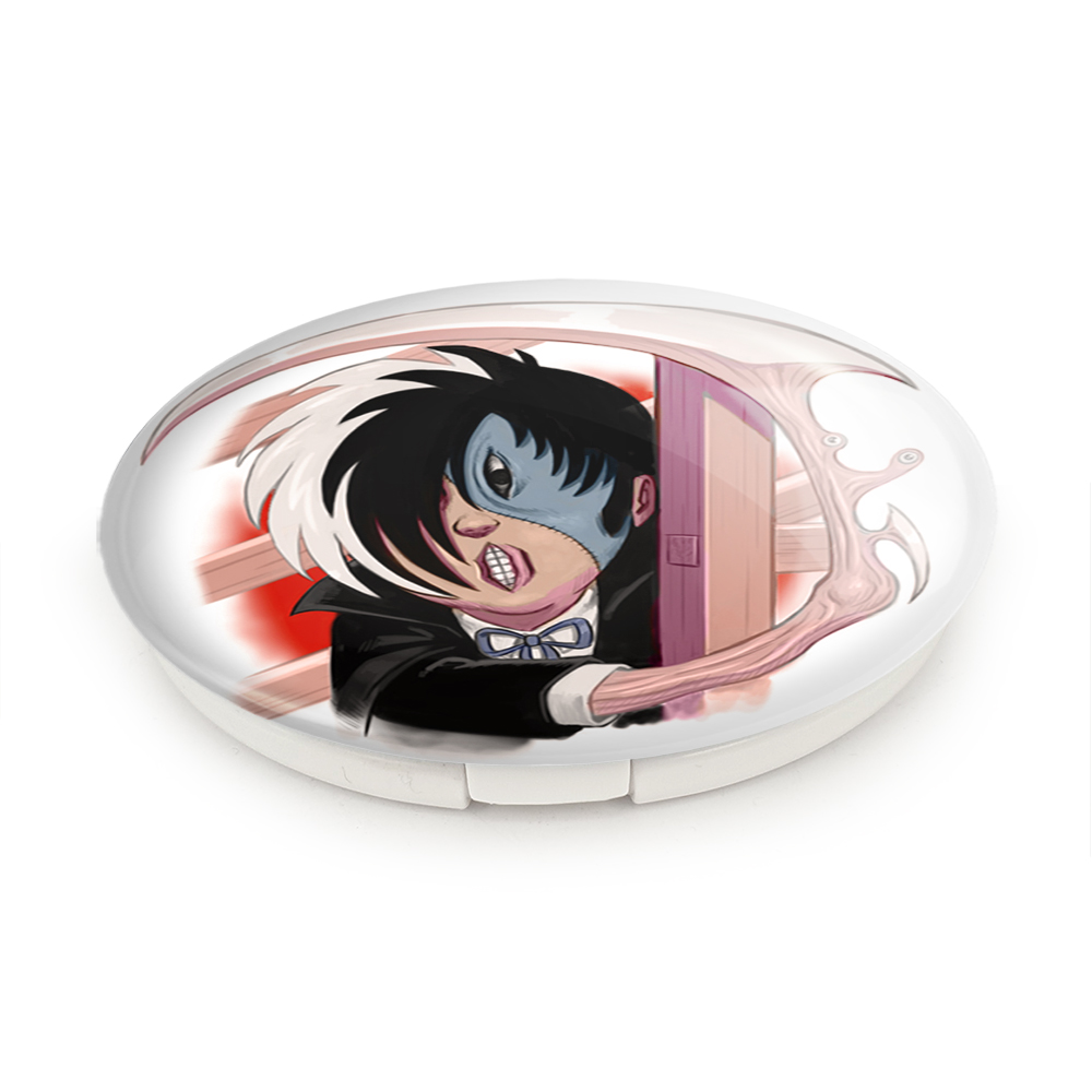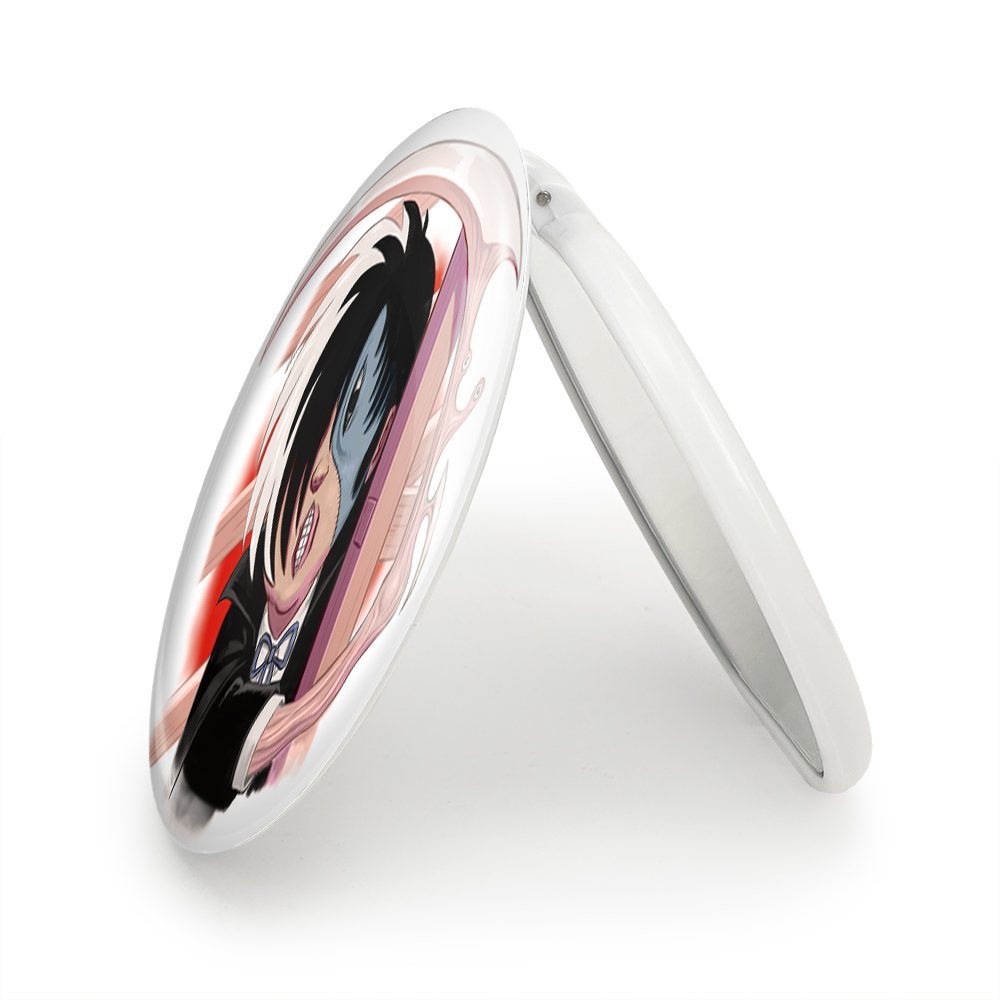 آینه های تاشو ایزومی انیمه انگل خندالو، از جنس پلاستیک فشرده ABS تولید شده و به رنگ سفید می باشد. یکی از آینه ها ابعاد واقعی را نشان داده و دیگری با قابلیت بزرگنمایی، جزئیات را بهتر نمایش می دهد. ابعاد هر یک از آینه ها، دایره ای به قطر 7.5 سانت می باشد که نه خیلی بزرگ و غیر قابل استفاده در کیف آرایشی ست و نه خیلی کوچک که تصویر خاصی در آن مشاهده نشود. آینه تاشو ایزومی انیمه انگل سایزی استاندارد و کارآمد دارد و در هر کیفی جا میگیرد. چاپ طرح بوسیله چاپگرهای دیجیتال شش رنگ با شفافیت و کیفیتی مثال زدنی بر روی یک وجه از بدنه ی آینه انجام گرفته و با روکش لمینت حرارتی پوشیده شده که در مقابل آسیب و خط و خش مقاوم بوده و کیفیت بالایی دارد. درب آینه بوسیله قفل بدنه ی آن، باز نمی ماند و کاملا بسته می شود و مناسب قرار گیری در کیف لوازم آرایش و کیف های کوچک دستی نیز هست. آینه های تاشو ایزومی انیمه انگل خندالو با تنوع طرحی بسیار بالا، سلیقه هر نوع مخاطبی را تامین میکند.