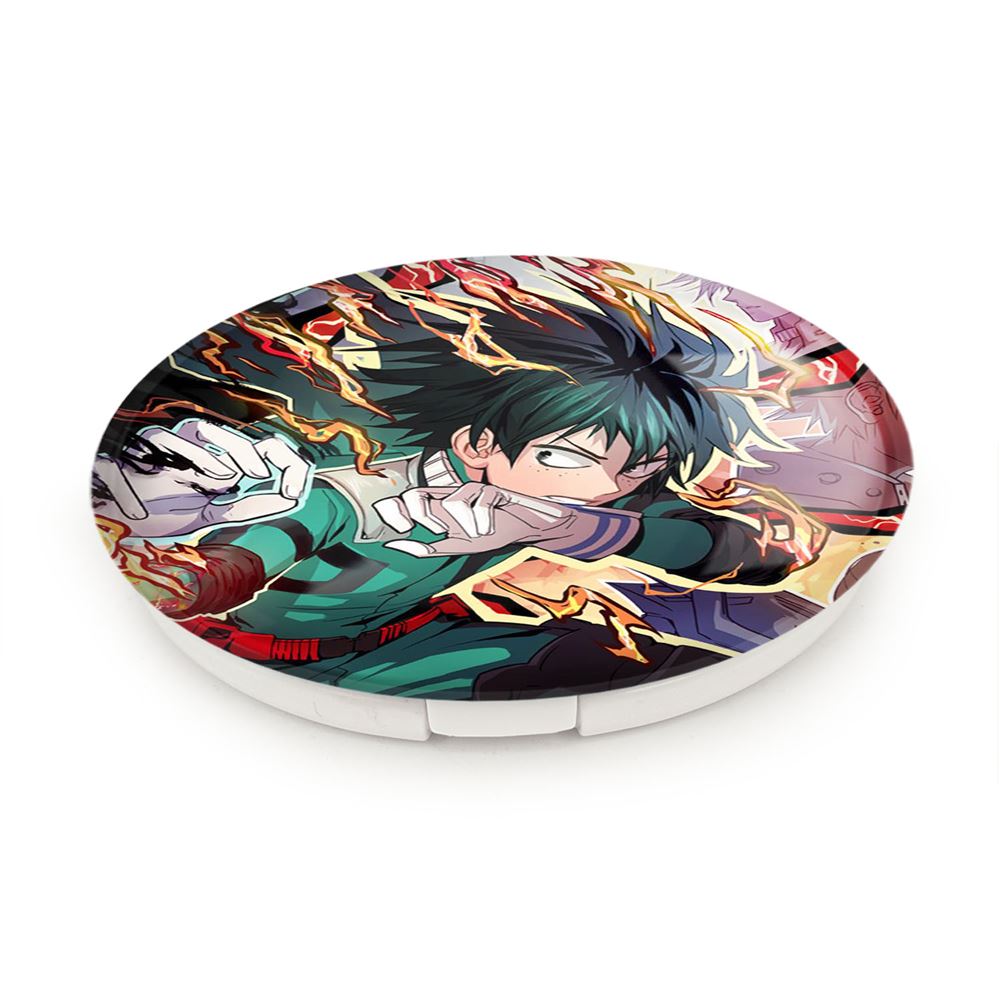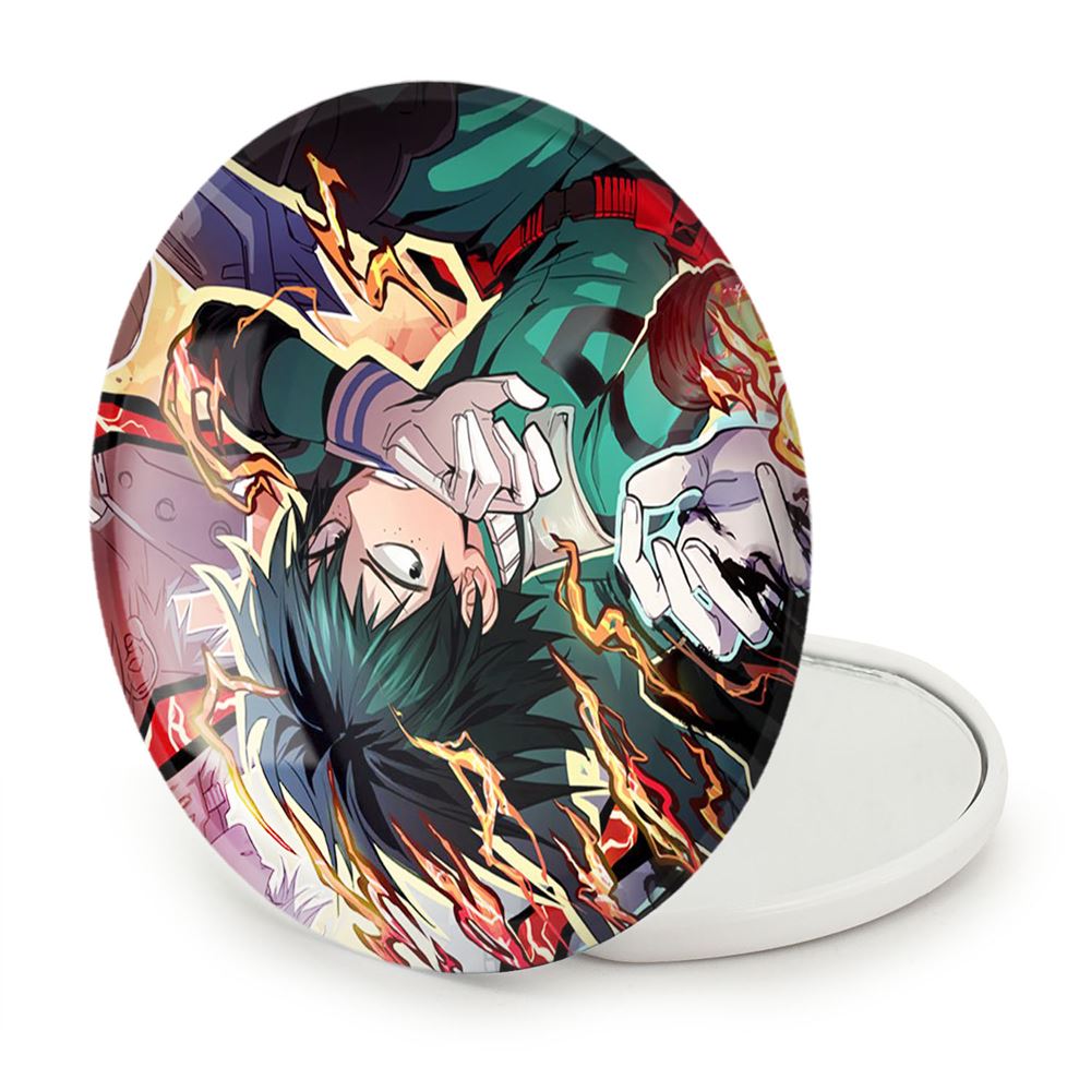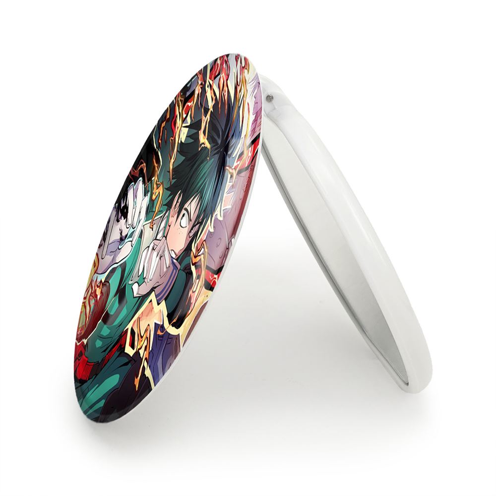 آینه های تاشو ایزوکو میدوریا انیمه آکادمی قهرمان من My Hero Academia خندالو، از جنس پلاستیک فشرده ABS تولید شده و به رنگ سفید می باشد. یکی از آینه ها ابعاد واقعی را نشان داده و دیگری با قابلیت بزرگنمایی، جزئیات را بهتر نمایش می دهد. ابعاد هر یک از آینه ها، دایره ای به قطر 7.5 سانت می باشد که نه خیلی بزرگ و غیر قابل استفاده در کیف آرایشی ست و نه خیلی کوچک که تصویر خاصی در آن مشاهده نشود. آینه تاشو ایزوکو میدوریا انیمه آکادمی قهرمان من My Hero Academia سایزی استاندارد و کارآمد دارد و در هر کیفی جا میگیرد. چاپ طرح بوسیله چاپگرهای دیجیتال شش رنگ با شفافیت و کیفیتی مثال زدنی بر روی یک وجه از بدنه ی آینه انجام گرفته و با روکش لمینت حرارتی پوشیده شده که در مقابل آسیب و خط و خش مقاوم بوده و کیفیت بالایی دارد. درب آینه بوسیله قفل بدنه ی آن، باز نمی ماند و کاملا بسته می شود و مناسب قرار گیری در کیف لوازم آرایش و کیف های کوچک دستی نیز هست. آینه های تاشو ایزوکو میدوریا انیمه آکادمی قهرمان من My Hero Academia خندالو با تنوع طرحی بسیار بالا، سلیقه هر نوع مخاطبی را تامین میکند.