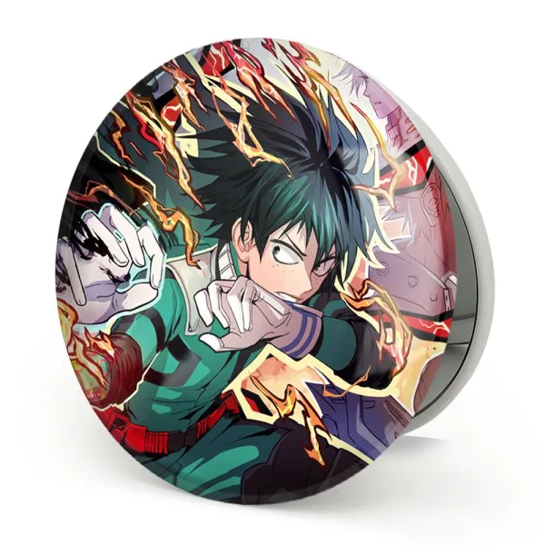 آینه های تاشو ایزوکو میدوریا انیمه آکادمی قهرمان من My Hero Academia خندالو، از جنس پلاستیک فشرده ABS تولید شده و به رنگ سفید می باشد. یکی از آینه ها ابعاد واقعی را نشان داده و دیگری با قابلیت بزرگنمایی، جزئیات را بهتر نمایش می دهد. ابعاد هر یک از آینه ها، دایره ای به قطر 7.5 سانت می باشد که نه خیلی بزرگ و غیر قابل استفاده در کیف آرایشی ست و نه خیلی کوچک که تصویر خاصی در آن مشاهده نشود. آینه تاشو ایزوکو میدوریا انیمه آکادمی قهرمان من My Hero Academia سایزی استاندارد و کارآمد دارد و در هر کیفی جا میگیرد. چاپ طرح بوسیله چاپگرهای دیجیتال شش رنگ با شفافیت و کیفیتی مثال زدنی بر روی یک وجه از بدنه ی آینه انجام گرفته و با روکش لمینت حرارتی پوشیده شده که در مقابل آسیب و خط و خش مقاوم بوده و کیفیت بالایی دارد. درب آینه بوسیله قفل بدنه ی آن، باز نمی ماند و کاملا بسته می شود و مناسب قرار گیری در کیف لوازم آرایش و کیف های کوچک دستی نیز هست. آینه های تاشو ایزوکو میدوریا انیمه آکادمی قهرمان من My Hero Academia خندالو با تنوع طرحی بسیار بالا، سلیقه هر نوع مخاطبی را تامین میکند.