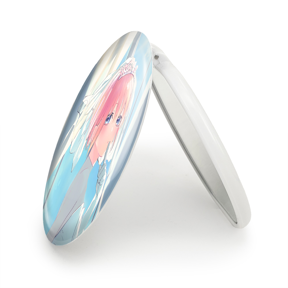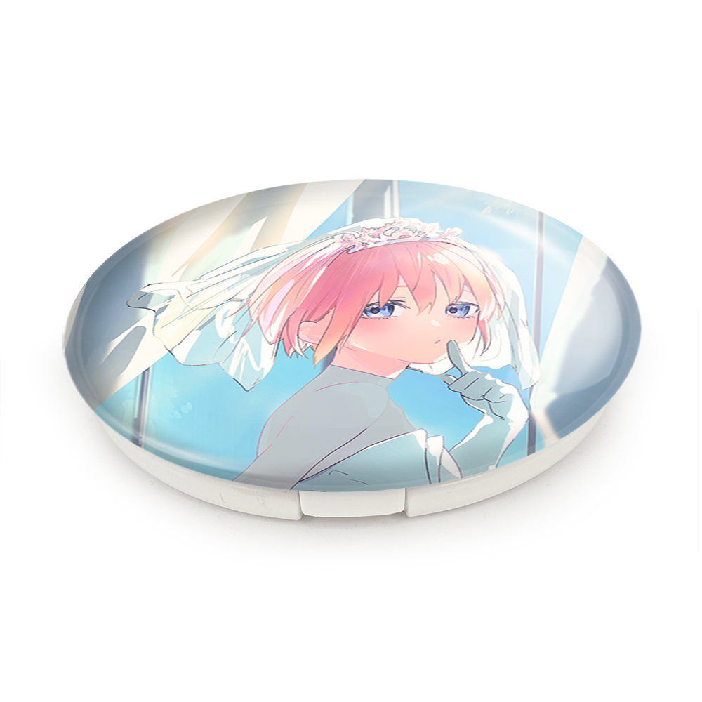 آینه های تاشو ایچیکا انیمه پنج عروس مساوی خندالو، از جنس پلاستیک فشرده ABS تولید شده و به رنگ سفید می باشد. یکی از آینه ها ابعاد واقعی را نشان داده و دیگری با قابلیت بزرگنمایی، جزئیات را بهتر نمایش می دهد. ابعاد هر یک از آینه ها، دایره ای به قطر 7.5 سانت می باشد که نه خیلی بزرگ و غیر قابل استفاده در کیف آرایشی ست و نه خیلی کوچک که تصویر خاصی در آن مشاهده نشود. آینه تاشو ایچیکا انیمه پنج عروس مساوی سایزی استاندارد و کارآمد دارد و در هر کیفی جا میگیرد. چاپ طرح بوسیله چاپگرهای دیجیتال شش رنگ با شفافیت و کیفیتی مثال زدنی بر روی یک وجه از بدنه ی آینه انجام گرفته و با روکش لمینت حرارتی پوشیده شده که در مقابل آسیب و خط و خش مقاوم بوده و کیفیت بالایی دارد. درب آینه بوسیله قفل بدنه ی آن، باز نمی ماند و کاملا بسته می شود و مناسب قرار گیری در کیف لوازم آرایش و کیف های کوچک دستی نیز هست. آینه های تاشو ایچیکا انیمه پنج عروس مساوی خندالو با تنوع طرحی بسیار بالا، سلیقه هر نوع مخاطبی را تامین میکند.