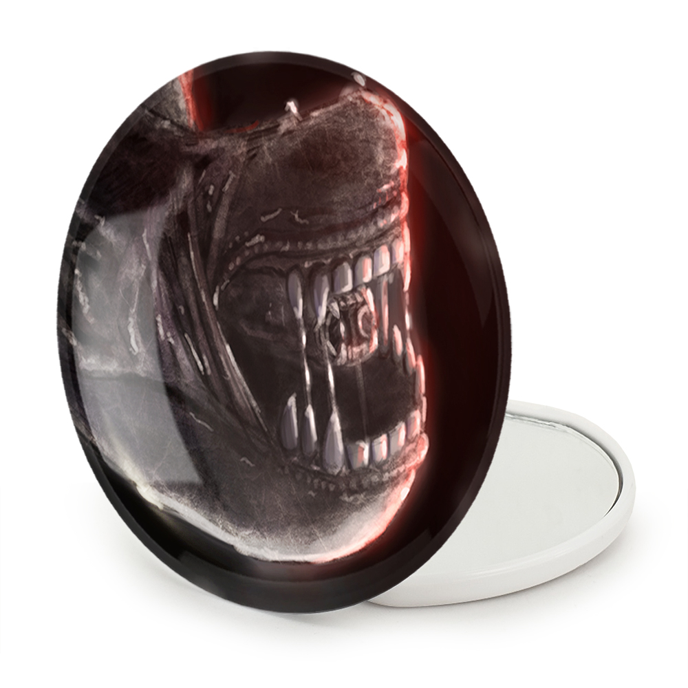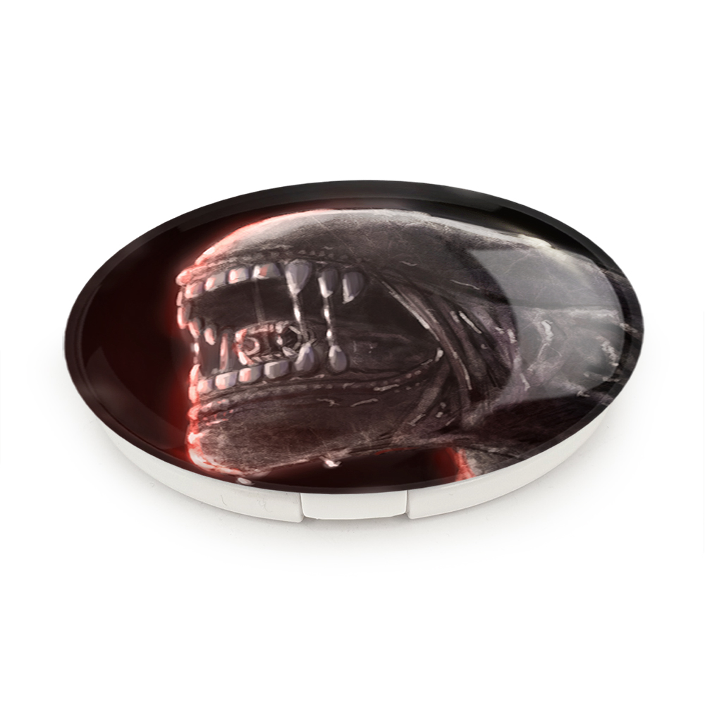 آینه های تاشو بازی بیگانه (Alien) خندالو، از جنس پلاستیک فشرده ABS تولید شده و به رنگ سفید می باشد. یکی از آینه ها ابعاد واقعی را نشان داده و دیگری با قابلیت بزرگنمایی، جزئیات را بهتر نمایش می دهد. ابعاد هر یک از آینه ها، دایره ای به قطر 7.5 سانت می باشد که نه خیلی بزرگ و غیر قابل استفاده در کیف آرایشی ست و نه خیلی کوچک که تصویر خاصی در آن مشاهده نشود. آینه تاشو بازی بیگانه (Alien) سایزی استاندارد و کارآمد دارد و در هر کیفی جا میگیرد. چاپ طرح بوسیله چاپگرهای دیجیتال شش رنگ با شفافیت و کیفیتی مثال زدنی بر روی یک وجه از بدنه ی آینه انجام گرفته و با روکش لمینت حرارتی پوشیده شده که در مقابل آسیب و خط و خش مقاوم بوده و کیفیت بالایی دارد. درب آینه بوسیله قفل بدنه ی آن، باز نمی ماند و کاملا بسته می شود و مناسب قرار گیری در کیف لوازم آرایش و کیف های کوچک دستی نیز هست. آینه های تاشو بازی بیگانه (Alien) خندالو با تنوع طرحی بسیار بالا، سلیقه هر نوع مخاطبی را تامین میکند.