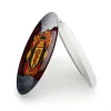 آینه های تاشو باشگاه منچستر یونایتد خندالو، از جنس پلاستیک فشرده ABS تولید شده و به رنگ سفید می باشد. یکی از آینه ها ابعاد واقعی را نشان داده و دیگری با قابلیت بزرگنمایی، جزئیات را بهتر نمایش می دهد. ابعاد هر یک از آینه ها، دایره ای به قطر 7.5 سانت می باشد که نه خیلی بزرگ و غیر قابل استفاده در کیف آرایشی ست و نه خیلی کوچک که تصویر خاصی در آن مشاهده نشود. آینه تاشو باشگاه منچستر یونایتد سایزی استاندارد و کارآمد دارد و در هر کیفی جا میگیرد. چاپ طرح بوسیله چاپگرهای دیجیتال شش رنگ با شفافیت و کیفیتی مثال زدنی بر روی یک وجه از بدنه ی آینه انجام گرفته و با روکش لمینت حرارتی پوشیده شده که در مقابل آسیب و خط و خش مقاوم بوده و کیفیت بالایی دارد. درب آینه بوسیله قفل بدنه ی آن، باز نمی ماند و کاملا بسته می شود و مناسب قرار گیری در کیف لوازم آرایش و کیف های کوچک دستی نیز هست. آینه های تاشو باشگاه منچستر یونایتد خندالو با تنوع طرحی بسیار بالا، سلیقه هر نوع مخاطبی را تامین میکند.