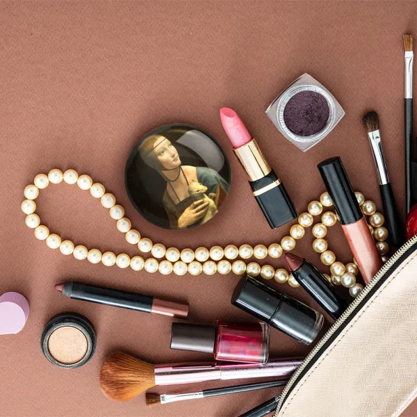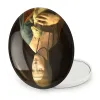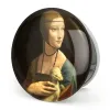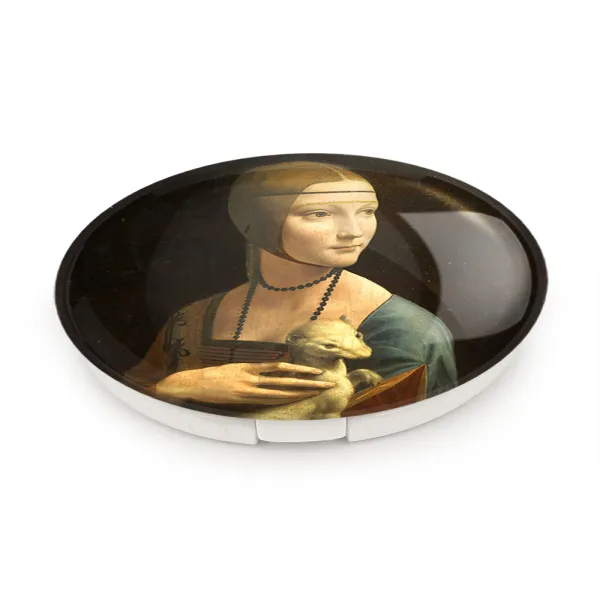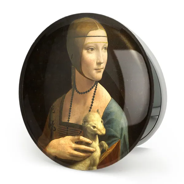 آینه های تاشو بانویی با قاقم لئوناردو داوینچی خندالو، از جنس پلاستیک فشرده ABS تولید شده و به رنگ سفید می باشد. یکی از آینه ها ابعاد واقعی را نشان داده و دیگری با قابلیت بزرگنمایی، جزئیات را بهتر نمایش می دهد. ابعاد هر یک از آینه ها، دایره ای به قطر 7.5 سانت می باشد که نه خیلی بزرگ و غیر قابل استفاده در کیف آرایشی ست و نه خیلی کوچک که تصویر خاصی در آن مشاهده نشود. آینه تاشو بانویی با قاقم لئوناردو داوینچی سایزی استاندارد و کارآمد دارد و در هر کیفی جا میگیرد. چاپ طرح بوسیله چاپگرهای دیجیتال شش رنگ با شفافیت و کیفیتی مثال زدنی بر روی یک وجه از بدنه ی آینه انجام گرفته و با روکش لمینت حرارتی پوشیده شده که در مقابل آسیب و خط و خش مقاوم بوده و کیفیت بالایی دارد. درب آینه بوسیله قفل بدنه ی آن، باز نمی ماند و کاملا بسته می شود و مناسب قرار گیری در کیف لوازم آرایش و کیف های کوچک دستی نیز هست. آینه های تاشو بانویی با قاقم لئوناردو داوینچی خندالو با تنوع طرحی بسیار بالا، سلیقه هر نوع مخاطبی را تامین میکند.