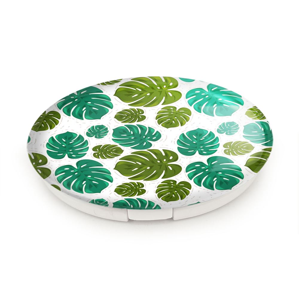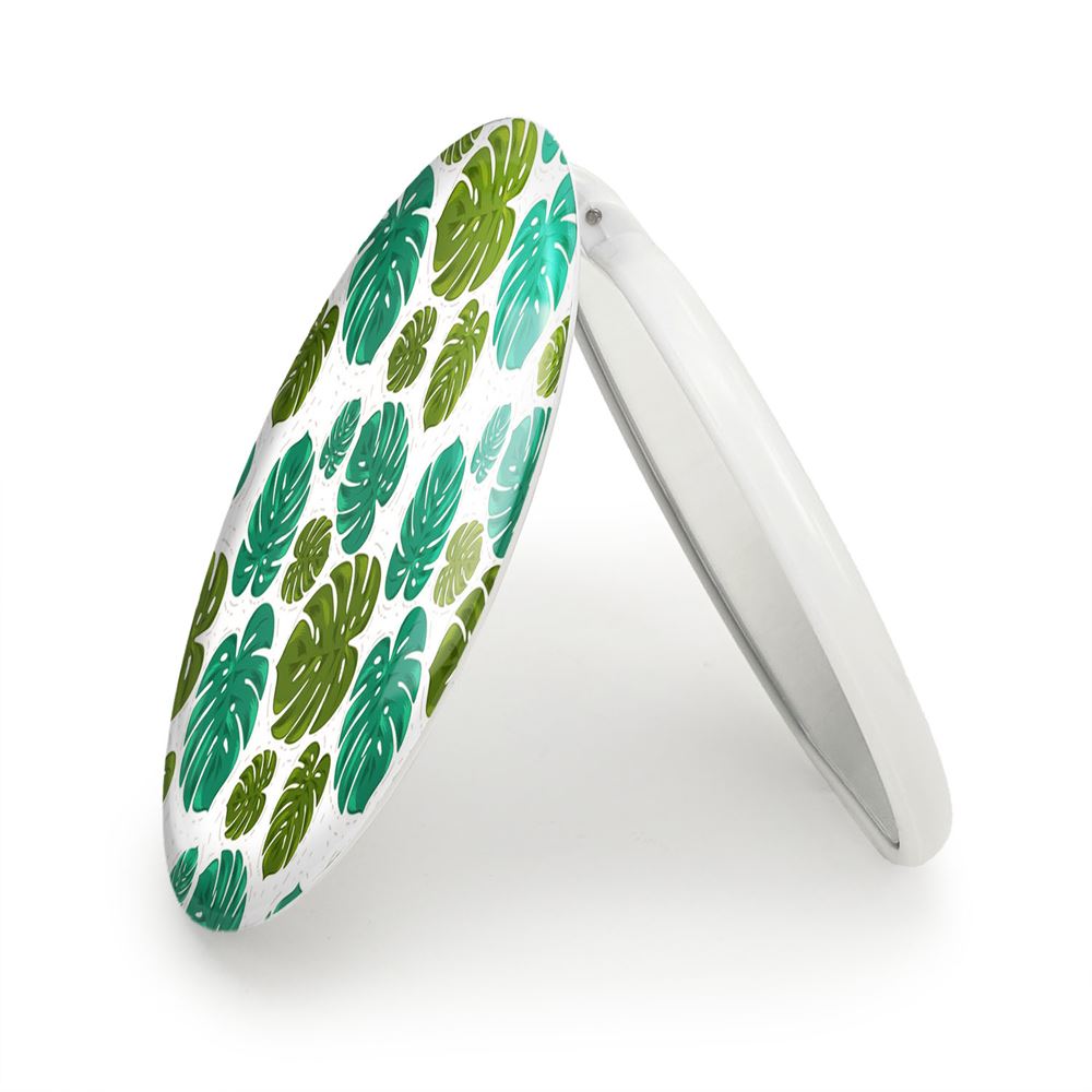 آینه های تاشو برگ انجیری خندالو، از جنس پلاستیک فشرده ABS تولید شده و به رنگ سفید می باشد. یکی از آینه ها ابعاد واقعی را نشان داده و دیگری با قابلیت بزرگنمایی، جزئیات را بهتر نمایش می دهد. ابعاد هر یک از آینه ها، دایره ای به قطر 7.5 سانت می باشد که نه خیلی بزرگ و غیر قابل استفاده در کیف آرایشی ست و نه خیلی کوچک که تصویر خاصی در آن مشاهده نشود. آینه تاشو برگ انجیری سایزی استاندارد و کارآمد دارد و در هر کیفی جا میگیرد. چاپ طرح بوسیله چاپگرهای دیجیتال شش رنگ با شفافیت و کیفیتی مثال زدنی بر روی یک وجه از بدنه ی آینه انجام گرفته و با روکش لمینت حرارتی پوشیده شده که در مقابل آسیب و خط و خش مقاوم بوده و کیفیت بالایی دارد. درب آینه بوسیله قفل بدنه ی آن، باز نمی ماند و کاملا بسته می شود و مناسب قرار گیری در کیف لوازم آرایش و کیف های کوچک دستی نیز هست. آینه های تاشو برگ انجیری خندالو با تنوع طرحی بسیار بالا، سلیقه هر نوع مخاطبی را تامین میکند.