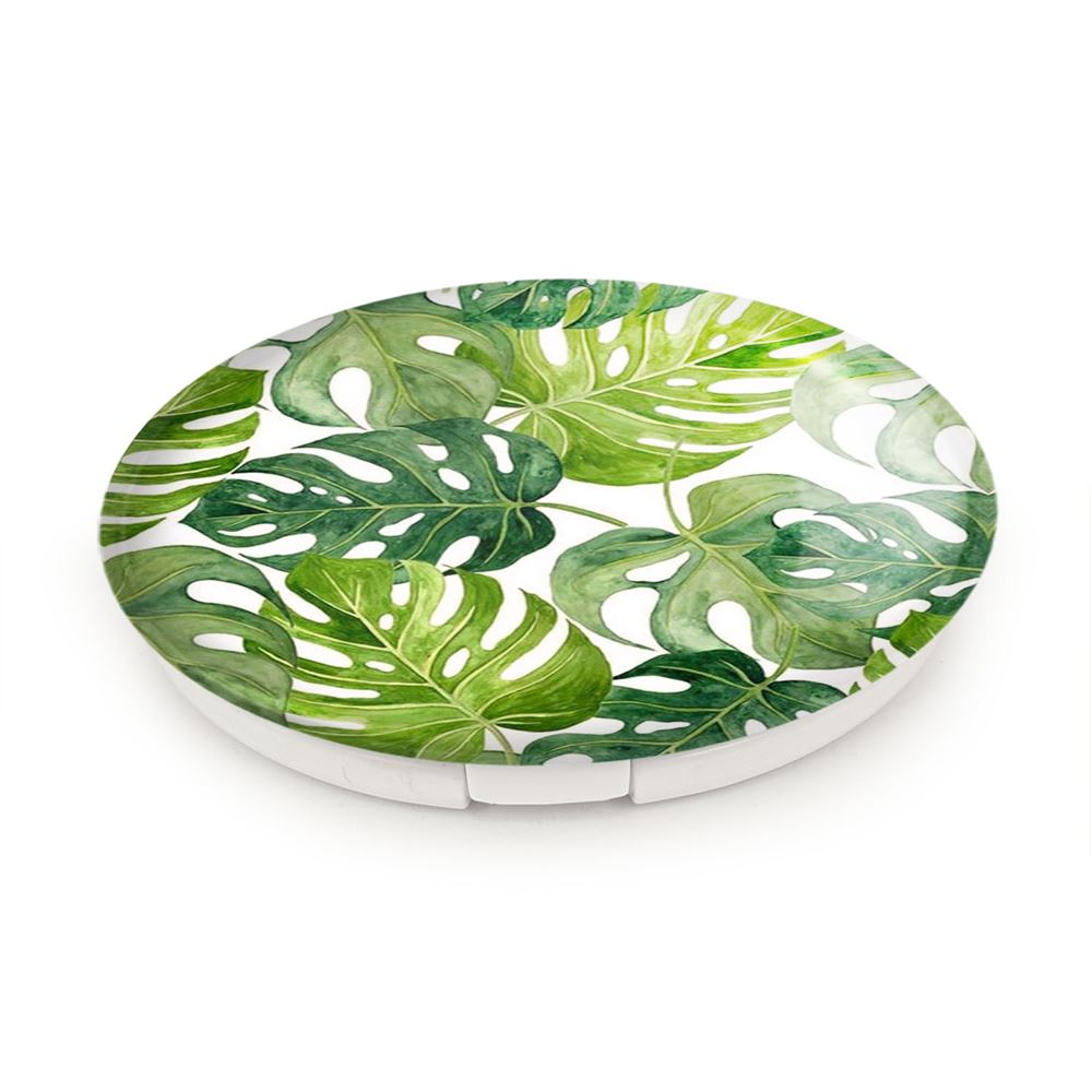 آینه های تاشو برگ انجیری خندالو، از جنس پلاستیک فشرده ABS تولید شده و به رنگ سفید می باشد. یکی از آینه ها ابعاد واقعی را نشان داده و دیگری با قابلیت بزرگنمایی، جزئیات را بهتر نمایش می دهد. ابعاد هر یک از آینه ها، دایره ای به قطر 7.5 سانت می باشد که نه خیلی بزرگ و غیر قابل استفاده در کیف آرایشی ست و نه خیلی کوچک که تصویر خاصی در آن مشاهده نشود. آینه تاشو برگ انجیری سایزی استاندارد و کارآمد دارد و در هر کیفی جا میگیرد. چاپ طرح بوسیله چاپگرهای دیجیتال شش رنگ با شفافیت و کیفیتی مثال زدنی بر روی یک وجه از بدنه ی آینه انجام گرفته و با روکش لمینت حرارتی پوشیده شده که در مقابل آسیب و خط و خش مقاوم بوده و کیفیت بالایی دارد. درب آینه بوسیله قفل بدنه ی آن، باز نمی ماند و کاملا بسته می شود و مناسب قرار گیری در کیف لوازم آرایش و کیف های کوچک دستی نیز هست. آینه های تاشو برگ انجیری خندالو با تنوع طرحی بسیار بالا، سلیقه هر نوع مخاطبی را تامین میکند.