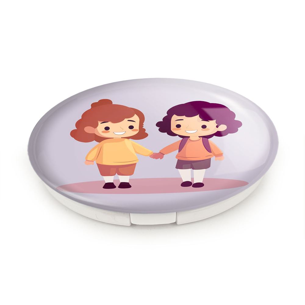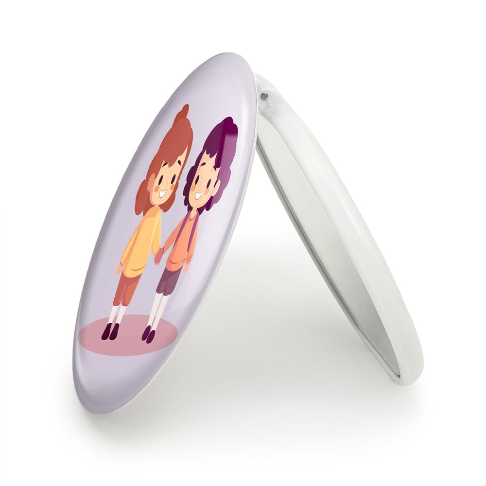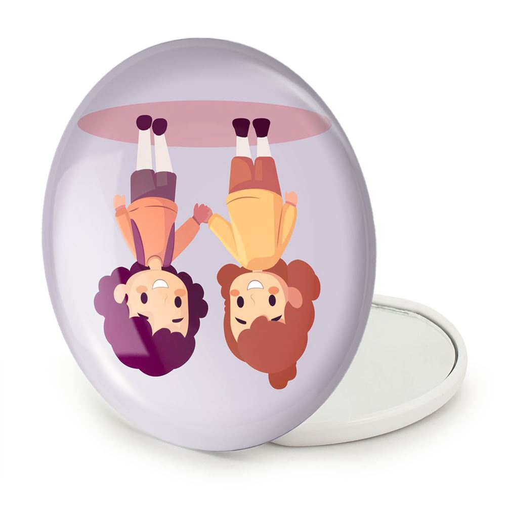 آینه های تاشو بهترین دوستان Best Friends خندالو، از جنس پلاستیک فشرده ABS تولید شده و به رنگ سفید می باشد. یکی از آینه ها ابعاد واقعی را نشان داده و دیگری با قابلیت بزرگنمایی، جزئیات را بهتر نمایش می دهد. ابعاد هر یک از آینه ها، دایره ای به قطر 7.5 سانت می باشد که نه خیلی بزرگ و غیر قابل استفاده در کیف آرایشی ست و نه خیلی کوچک که تصویر خاصی در آن مشاهده نشود. آینه تاشو بهترین دوستان Best Friends سایزی استاندارد و کارآمد دارد و در هر کیفی جا میگیرد. چاپ طرح بوسیله چاپگرهای دیجیتال شش رنگ با شفافیت و کیفیتی مثال زدنی بر روی یک وجه از بدنه ی آینه انجام گرفته و با روکش لمینت حرارتی پوشیده شده که در مقابل آسیب و خط و خش مقاوم بوده و کیفیت بالایی دارد. درب آینه بوسیله قفل بدنه ی آن، باز نمی ماند و کاملا بسته می شود و مناسب قرار گیری در کیف لوازم آرایش و کیف های کوچک دستی نیز هست. آینه های تاشو بهترین دوستان Best Friends خندالو با تنوع طرحی بسیار بالا، سلیقه هر نوع مخاطبی را تامین میکند.