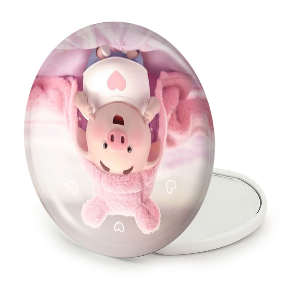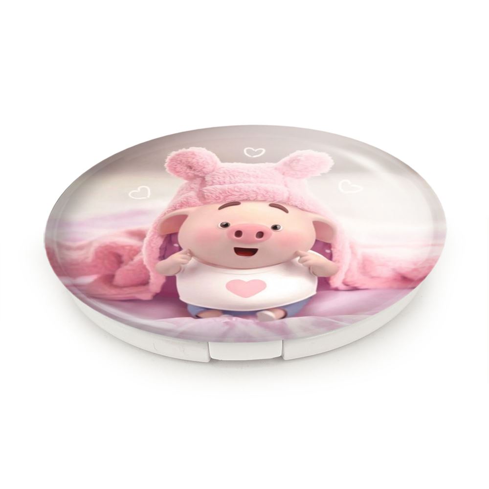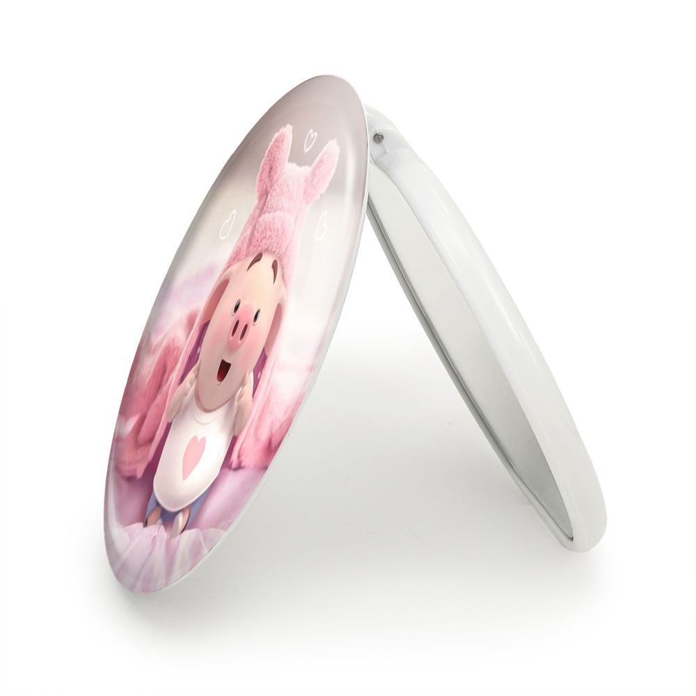آینه های تاشو بچه خوک خندالو، از جنس پلاستیک فشرده ABS تولید شده و به رنگ سفید می باشد. یکی از آینه ها ابعاد واقعی را نشان داده و دیگری با قابلیت بزرگنمایی، جزئیات را بهتر نمایش می دهد. ابعاد هر یک از آینه ها، دایره ای به قطر 7.5 سانت می باشد که نه خیلی بزرگ و غیر قابل استفاده در کیف آرایشی ست و نه خیلی کوچک که تصویر خاصی در آن مشاهده نشود. آینه تاشو بچه خوک سایزی استاندارد و کارآمد دارد و در هر کیفی جا میگیرد. چاپ طرح بوسیله چاپگرهای دیجیتال شش رنگ با شفافیت و کیفیتی مثال زدنی بر روی یک وجه از بدنه ی آینه انجام گرفته و با روکش لمینت حرارتی پوشیده شده که در مقابل آسیب و خط و خش مقاوم بوده و کیفیت بالایی دارد. درب آینه بوسیله قفل بدنه ی آن، باز نمی ماند و کاملا بسته می شود و مناسب قرار گیری در کیف لوازم آرایش و کیف های کوچک دستی نیز هست. آینه های تاشو بچه خوک خندالو با تنوع طرحی بسیار بالا، سلیقه هر نوع مخاطبی را تامین میکند.