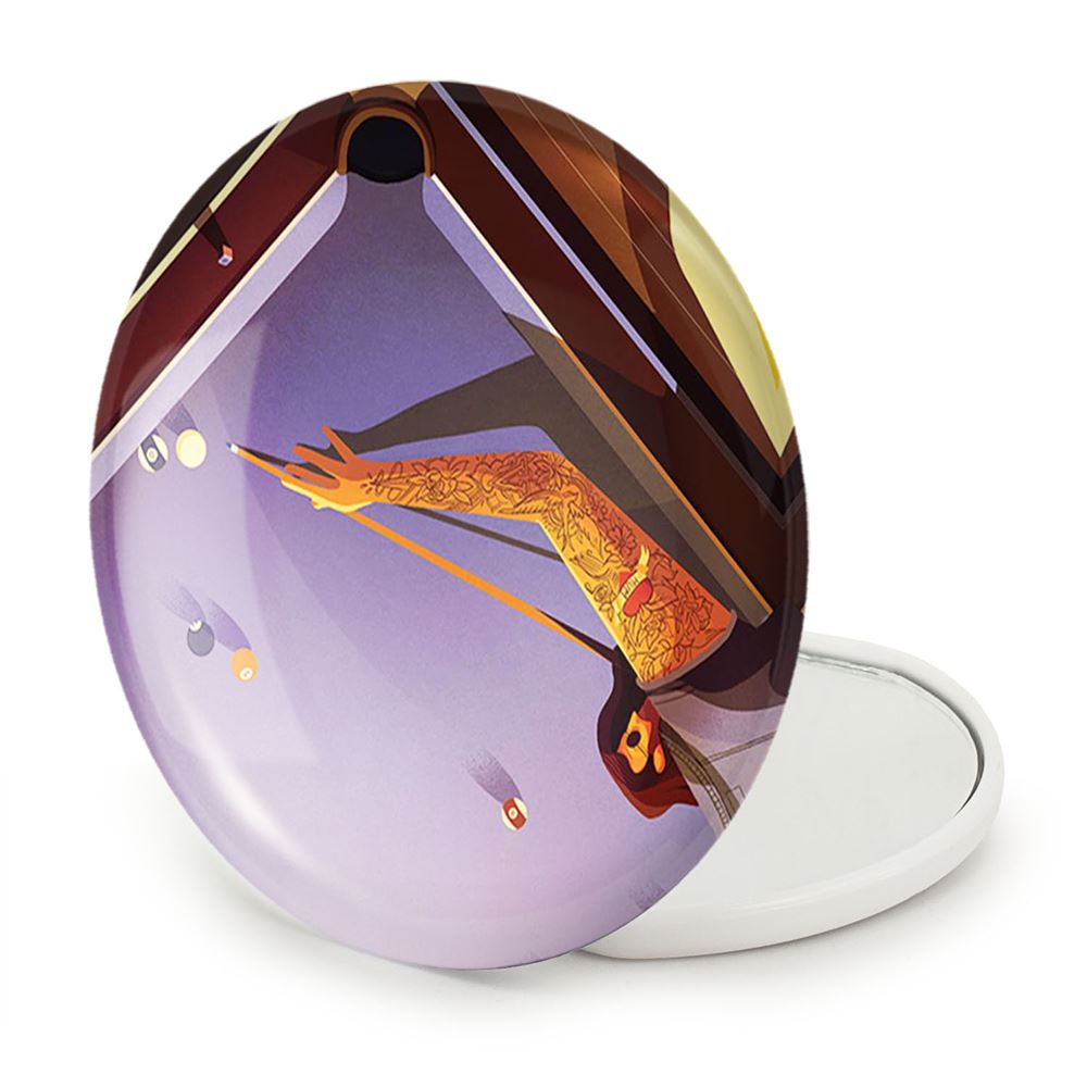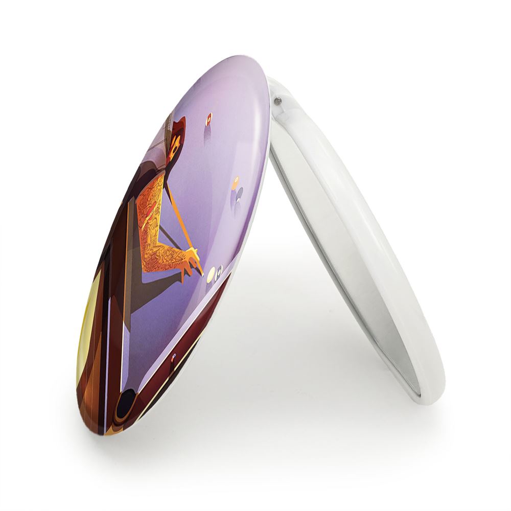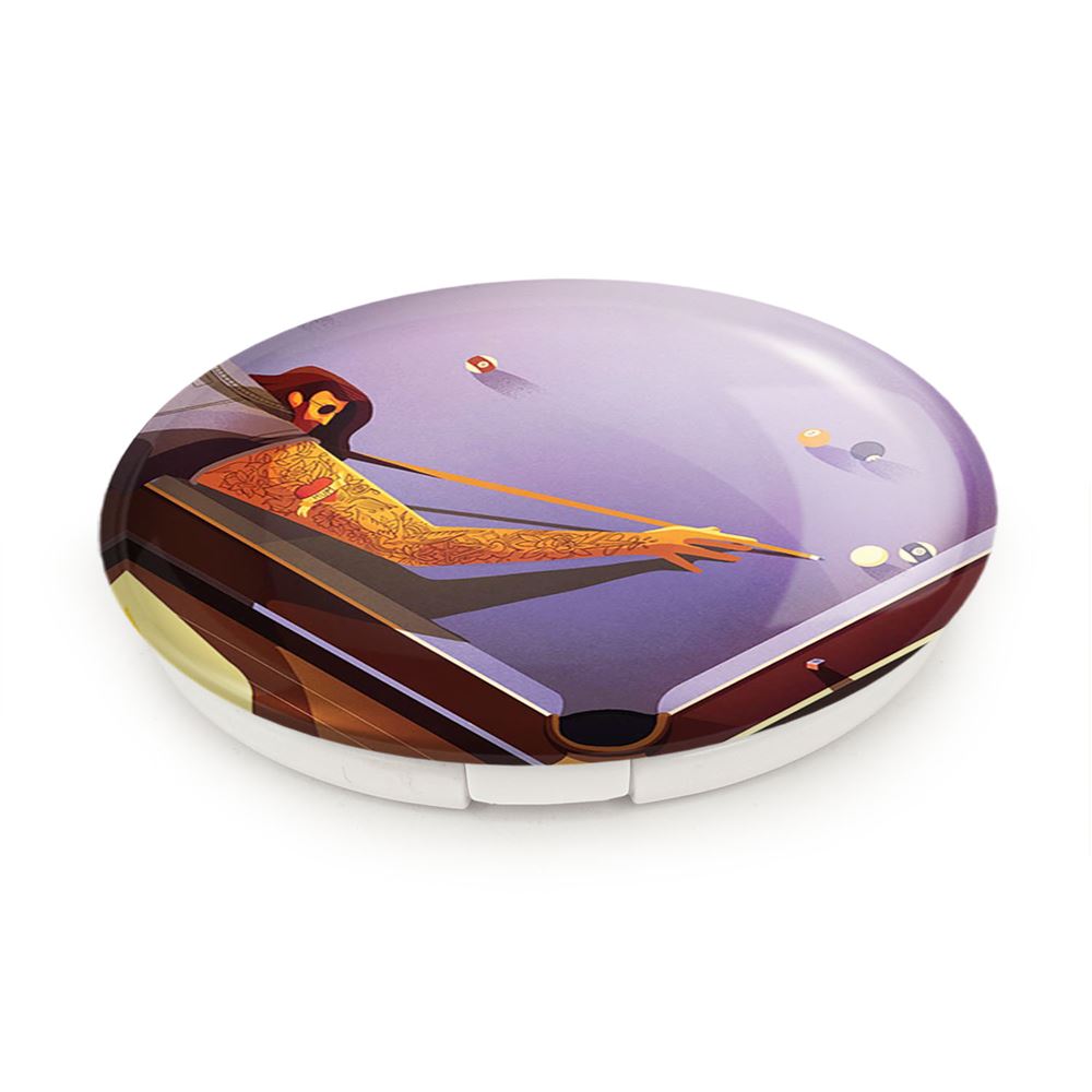 آینه های تاشو بیلیارد Billiard خندالو، از جنس پلاستیک فشرده ABS تولید شده و به رنگ سفید می باشد. یکی از آینه ها ابعاد واقعی را نشان داده و دیگری با قابلیت بزرگنمایی، جزئیات را بهتر نمایش می دهد. ابعاد هر یک از آینه ها، دایره ای به قطر 7.5 سانت می باشد که نه خیلی بزرگ و غیر قابل استفاده در کیف آرایشی ست و نه خیلی کوچک که تصویر خاصی در آن مشاهده نشود. آینه تاشو بیلیارد Billiard سایزی استاندارد و کارآمد دارد و در هر کیفی جا میگیرد. چاپ طرح بوسیله چاپگرهای دیجیتال شش رنگ با شفافیت و کیفیتی مثال زدنی بر روی یک وجه از بدنه ی آینه انجام گرفته و با روکش لمینت حرارتی پوشیده شده که در مقابل آسیب و خط و خش مقاوم بوده و کیفیت بالایی دارد. درب آینه بوسیله قفل بدنه ی آن، باز نمی ماند و کاملا بسته می شود و مناسب قرار گیری در کیف لوازم آرایش و کیف های کوچک دستی نیز هست. آینه های تاشو بیلیارد Billiard خندالو با تنوع طرحی بسیار بالا، سلیقه هر نوع مخاطبی را تامین میکند.