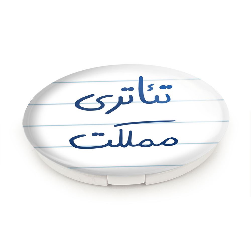 آینه های تاشو تئاتری مملکت خندالو، از جنس پلاستیک فشرده ABS تولید شده و به رنگ سفید می باشد. یکی از آینه ها ابعاد واقعی را نشان داده و دیگری با قابلیت بزرگنمایی، جزئیات را بهتر نمایش می دهد. ابعاد هر یک از آینه ها، دایره ای به قطر 7.5 سانت می باشد که نه خیلی بزرگ و غیر قابل استفاده در کیف آرایشی ست و نه خیلی کوچک که تصویر خاصی در آن مشاهده نشود. آینه تاشو تئاتری مملکت سایزی استاندارد و کارآمد دارد و در هر کیفی جا میگیرد. چاپ طرح بوسیله چاپگرهای دیجیتال شش رنگ با شفافیت و کیفیتی مثال زدنی بر روی یک وجه از بدنه ی آینه انجام گرفته و با روکش لمینت حرارتی پوشیده شده که در مقابل آسیب و خط و خش مقاوم بوده و کیفیت بالایی دارد. درب آینه بوسیله قفل بدنه ی آن، باز نمی ماند و کاملا بسته می شود و مناسب قرار گیری در کیف لوازم آرایش و کیف های کوچک دستی نیز هست. آینه های تاشو تئاتری مملکت خندالو با تنوع طرحی بسیار بالا، سلیقه هر نوع مخاطبی را تامین میکند.