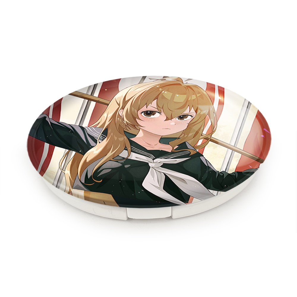 آینه های تاشو تایگا انیمه تورادور خندالو، از جنس پلاستیک فشرده ABS تولید شده و به رنگ سفید می باشد. یکی از آینه ها ابعاد واقعی را نشان داده و دیگری با قابلیت بزرگنمایی، جزئیات را بهتر نمایش می دهد. ابعاد هر یک از آینه ها، دایره ای به قطر 7.5 سانت می باشد که نه خیلی بزرگ و غیر قابل استفاده در کیف آرایشی ست و نه خیلی کوچک که تصویر خاصی در آن مشاهده نشود. آینه تاشو تایگا انیمه تورادور سایزی استاندارد و کارآمد دارد و در هر کیفی جا میگیرد. چاپ طرح بوسیله چاپگرهای دیجیتال شش رنگ با شفافیت و کیفیتی مثال زدنی بر روی یک وجه از بدنه ی آینه انجام گرفته و با روکش لمینت حرارتی پوشیده شده که در مقابل آسیب و خط و خش مقاوم بوده و کیفیت بالایی دارد. درب آینه بوسیله قفل بدنه ی آن، باز نمی ماند و کاملا بسته می شود و مناسب قرار گیری در کیف لوازم آرایش و کیف های کوچک دستی نیز هست. آینه های تاشو تایگا انیمه تورادور خندالو با تنوع طرحی بسیار بالا، سلیقه هر نوع مخاطبی را تامین میکند.