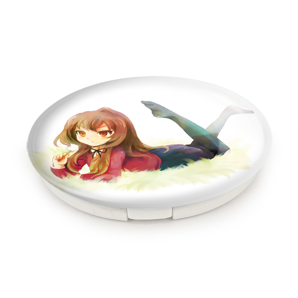 آینه های تاشو تایگا انیمه تورادور خندالو، از جنس پلاستیک فشرده ABS تولید شده و به رنگ سفید می باشد. یکی از آینه ها ابعاد واقعی را نشان داده و دیگری با قابلیت بزرگنمایی، جزئیات را بهتر نمایش می دهد. ابعاد هر یک از آینه ها، دایره ای به قطر 7.5 سانت می باشد که نه خیلی بزرگ و غیر قابل استفاده در کیف آرایشی ست و نه خیلی کوچک که تصویر خاصی در آن مشاهده نشود. آینه تاشو تایگا انیمه تورادور سایزی استاندارد و کارآمد دارد و در هر کیفی جا میگیرد. چاپ طرح بوسیله چاپگرهای دیجیتال شش رنگ با شفافیت و کیفیتی مثال زدنی بر روی یک وجه از بدنه ی آینه انجام گرفته و با روکش لمینت حرارتی پوشیده شده که در مقابل آسیب و خط و خش مقاوم بوده و کیفیت بالایی دارد. درب آینه بوسیله قفل بدنه ی آن، باز نمی ماند و کاملا بسته می شود و مناسب قرار گیری در کیف لوازم آرایش و کیف های کوچک دستی نیز هست. آینه های تاشو تایگا انیمه تورادور خندالو با تنوع طرحی بسیار بالا، سلیقه هر نوع مخاطبی را تامین میکند.