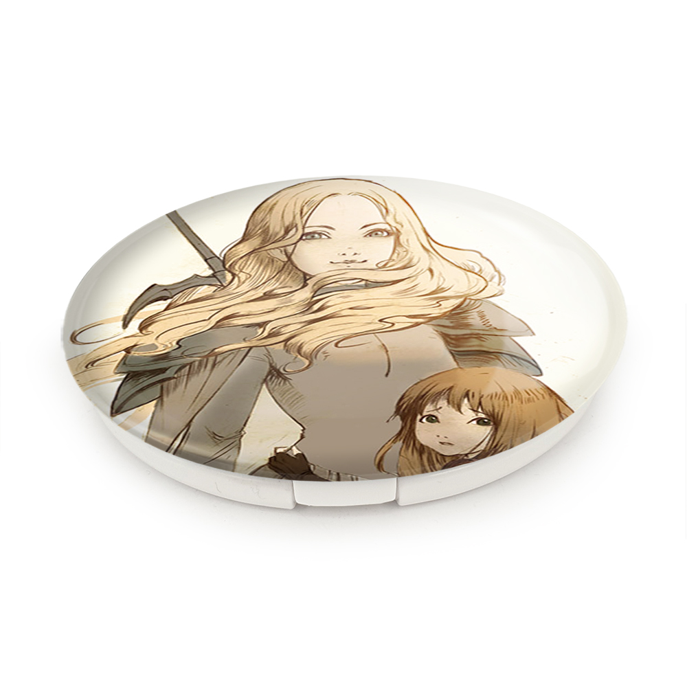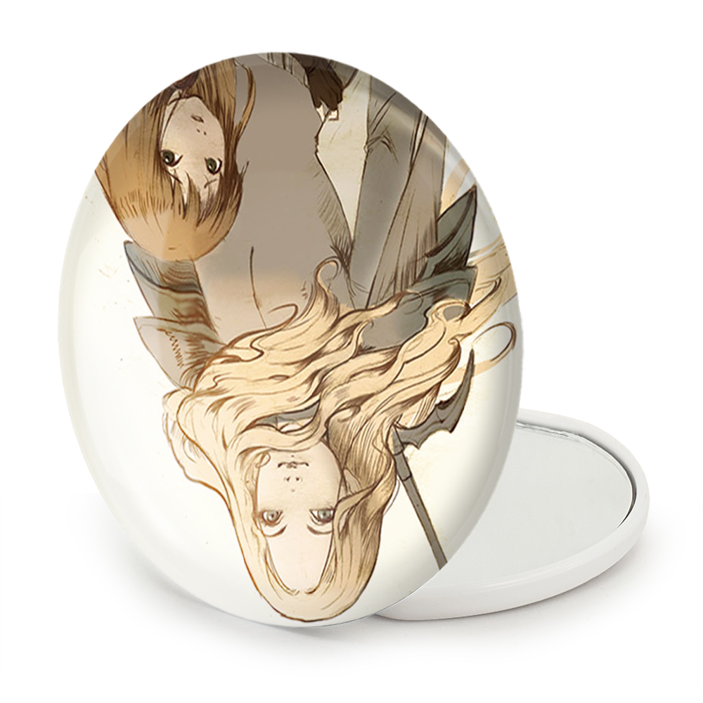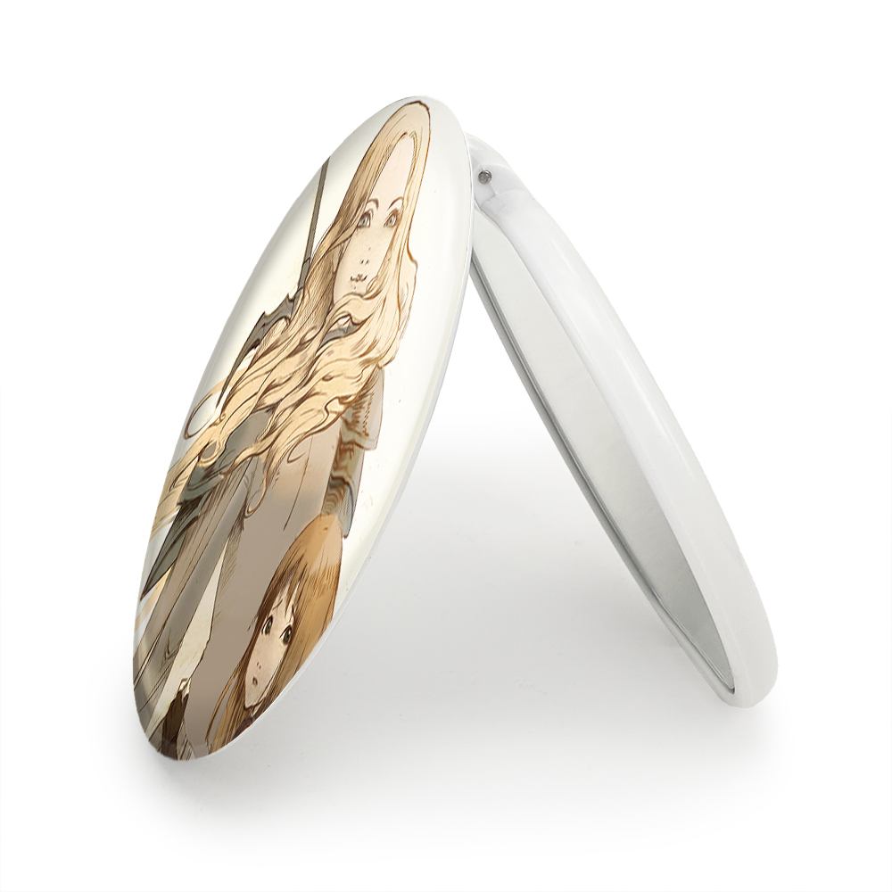 آینه های تاشو ترسا و کلر انیمه کلیمور خندالو، از جنس پلاستیک فشرده ABS تولید شده و به رنگ سفید می باشد. یکی از آینه ها ابعاد واقعی را نشان داده و دیگری با قابلیت بزرگنمایی، جزئیات را بهتر نمایش می دهد. ابعاد هر یک از آینه ها، دایره ای به قطر 7.5 سانت می باشد که نه خیلی بزرگ و غیر قابل استفاده در کیف آرایشی ست و نه خیلی کوچک که تصویر خاصی در آن مشاهده نشود. آینه تاشو ترسا و کلر انیمه کلیمور سایزی استاندارد و کارآمد دارد و در هر کیفی جا میگیرد. چاپ طرح بوسیله چاپگرهای دیجیتال شش رنگ با شفافیت و کیفیتی مثال زدنی بر روی یک وجه از بدنه ی آینه انجام گرفته و با روکش لمینت حرارتی پوشیده شده که در مقابل آسیب و خط و خش مقاوم بوده و کیفیت بالایی دارد. درب آینه بوسیله قفل بدنه ی آن، باز نمی ماند و کاملا بسته می شود و مناسب قرار گیری در کیف لوازم آرایش و کیف های کوچک دستی نیز هست. آینه های تاشو ترسا و کلر انیمه کلیمور خندالو با تنوع طرحی بسیار بالا، سلیقه هر نوع مخاطبی را تامین میکند.
