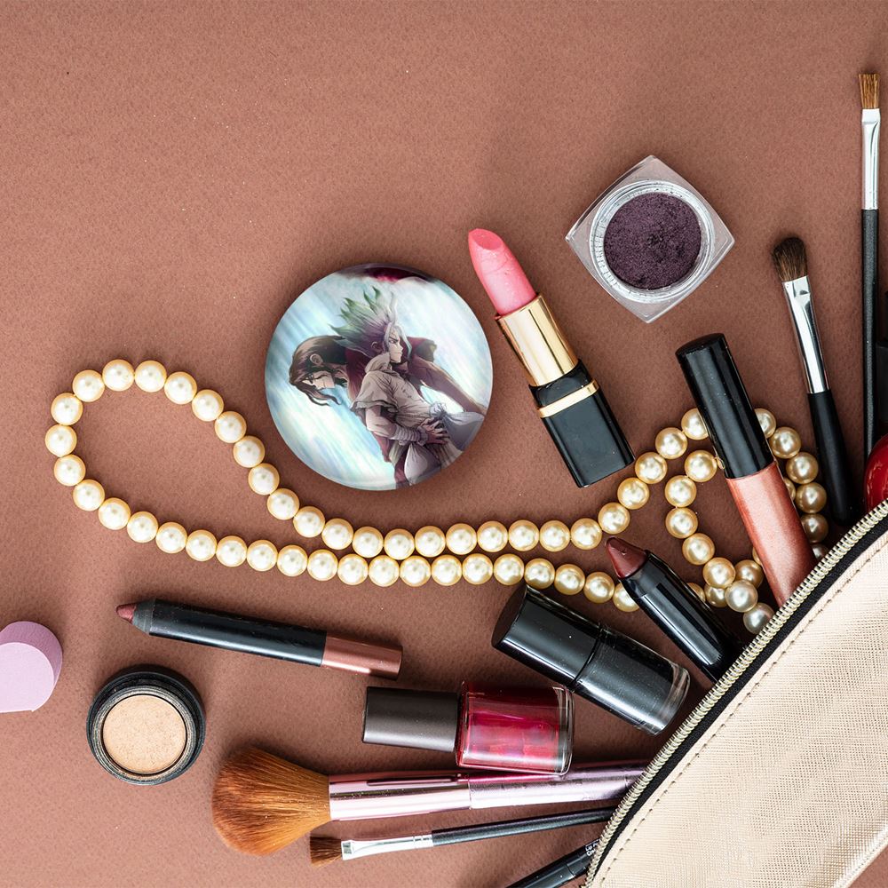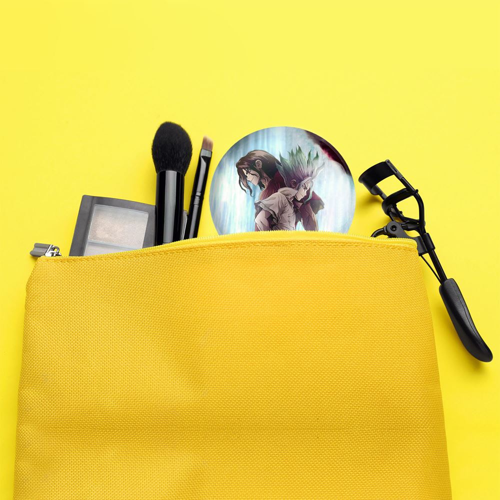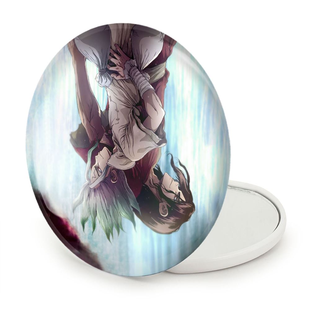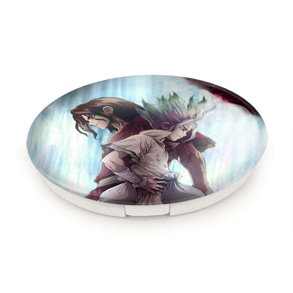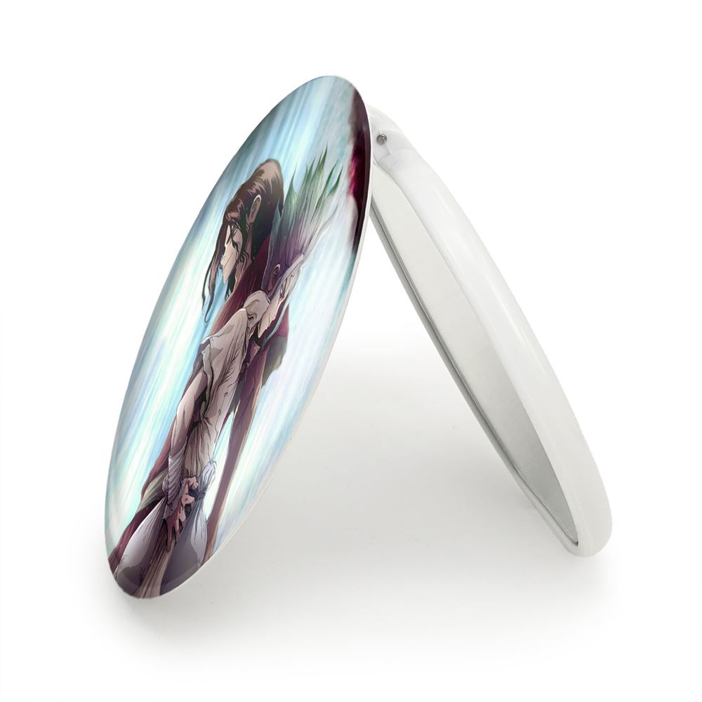 آینه های تاشو تسوکاسا شیشیو و سنکو انیمه دکتر استون Dr. Stone خندالو، از جنس پلاستیک فشرده ABS تولید شده و به رنگ سفید می باشد. یکی از آینه ها ابعاد واقعی را نشان داده و دیگری با قابلیت بزرگنمایی، جزئیات را بهتر نمایش می دهد. ابعاد هر یک از آینه ها، دایره ای به قطر 7.5 سانت می باشد که نه خیلی بزرگ و غیر قابل استفاده در کیف آرایشی ست و نه خیلی کوچک که تصویر خاصی در آن مشاهده نشود. آینه تاشو تسوکاسا شیشیو و سنکو انیمه دکتر استون Dr. Stone سایزی استاندارد و کارآمد دارد و در هر کیفی جا میگیرد. چاپ طرح بوسیله چاپگرهای دیجیتال شش رنگ با شفافیت و کیفیتی مثال زدنی بر روی یک وجه از بدنه ی آینه انجام گرفته و با روکش لمینت حرارتی پوشیده شده که در مقابل آسیب و خط و خش مقاوم بوده و کیفیت بالایی دارد. درب آینه بوسیله قفل بدنه ی آن، باز نمی ماند و کاملا بسته می شود و مناسب قرار گیری در کیف لوازم آرایش و کیف های کوچک دستی نیز هست. آینه های تاشو تسوکاسا شیشیو و سنکو انیمه دکتر استون Dr. Stone خندالو با تنوع طرحی بسیار بالا، سلیقه هر نوع مخاطبی را تامین میکند.